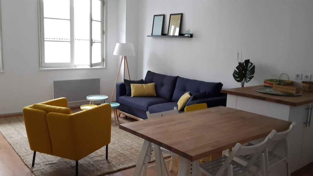 Grand T2 lumineux rénové avec soin au cœur de Bayonne. Emplacement rêvé : tout se fait à pied, des Halles aux jolies ruelles animées. Chambre Queen size, grande douche à l’italienne, cuisine équipée et bureau spacieux. Calme, charme et lumière pour un vrai cocon en plein centre. Escalier ancien, sans ascenseur au 4eme étage. Géré par ma conciergerie locale avec accueil attentionné et conseils personnalisés. ✨
