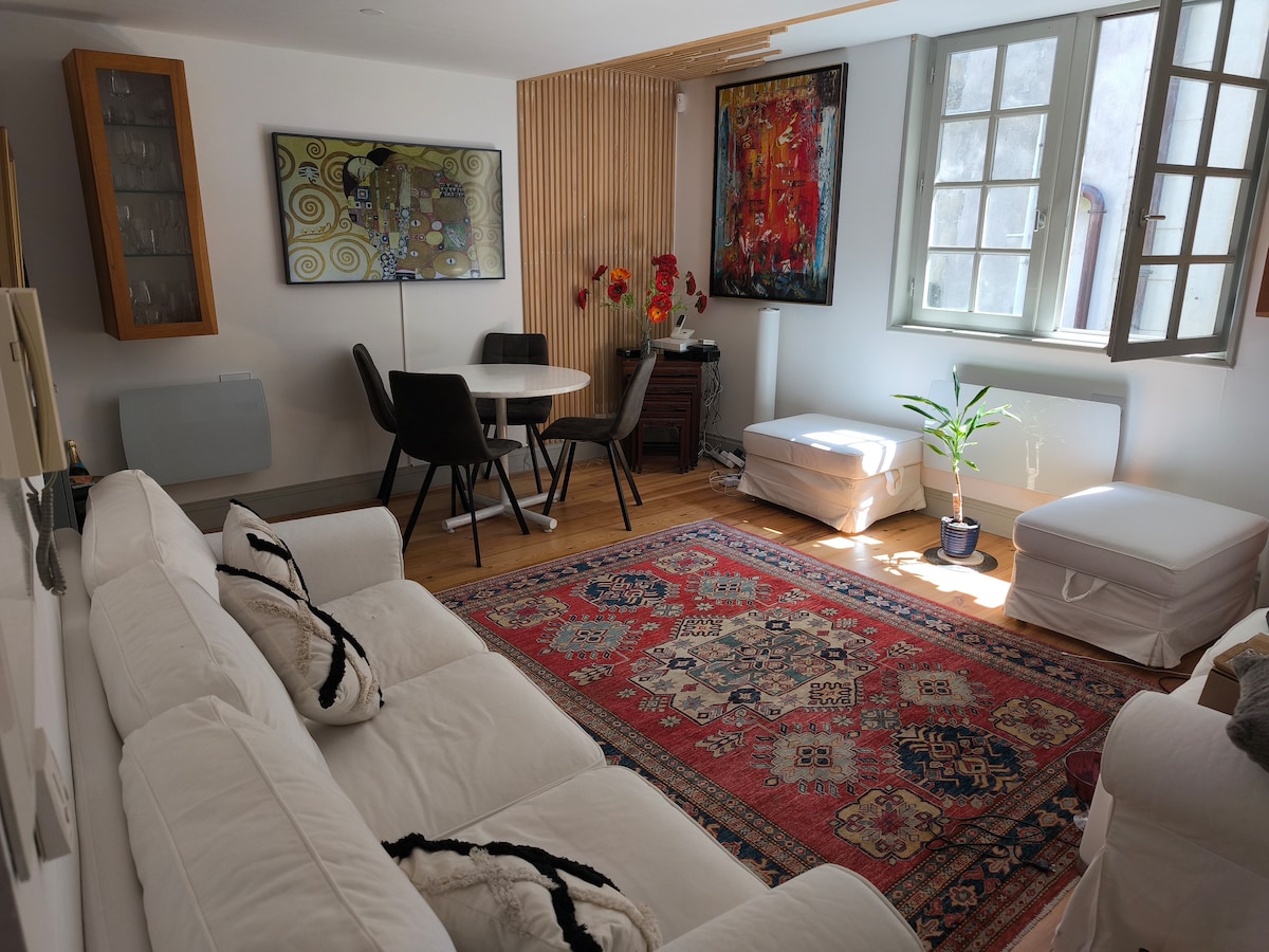 Charmant appartement dans le coeur historique de Bayonne au 4ème étage dans immeuble du 18ème siècle. Très lumineux avec une vue magnifique depuis le balcon sur la cathédrale. Idéal pour qui veut lier plaisirs de la plage et l'activité d'un quartier vivant à l'architecture exceptionnelle plein de restaurants et petits commerces de proximité. Secteur protégé et essentiellement piétonnier et à 11 minutes à pied d'un parking à 4€ / jour. Plages d'Anglet à 10 mns, Biarritz à 20 et l'Espagne à 40.