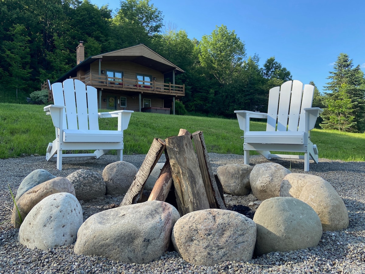 62 acres of secluded bliss high in the hills of Ellicottville w/therapeutic views across the valley. Swim in the sparkling spring-fed pond, mountain bike, hike or cross country ski through the private wooded groomed trails. Enjoy the sparkling night stars from the hot tub and kick back with friends at a bonfire. Forget the stress of traditional vacationing, restaurant reviews, & tourist traps. Recharge your battery & enjoy the freedom to reconnect with what and who makes you the happiest.