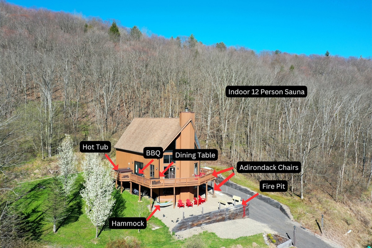 Welcome to our luxe Après Chalet! Beautifully renovated with design & comfort in mind, we're thrilled to welcome you to our gorgeous chalet featuring amazing views, luxe interior design and crowd-pleasing amenities (outdoor hot-tub, barrel sauna, fire-pit & more). This beautiful & private lot is surrounded by mature pine trees with amazing views of EVL skiing. Easy access to the center Ellicottville (4 min) and skiing, hiking/mountain biking trails, tubing, golfing & more (4-8 min)