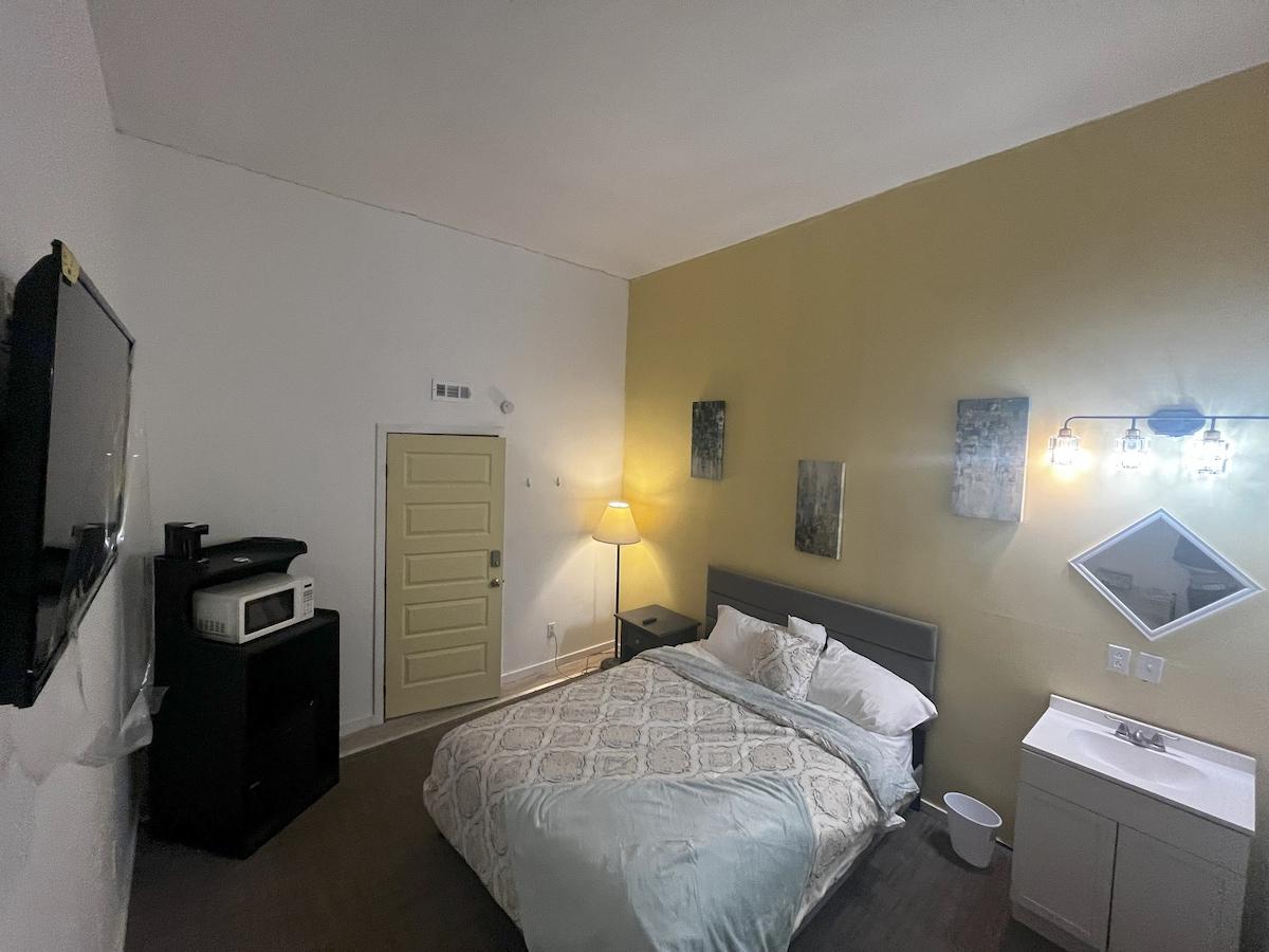 ➤ Welcome to Timberline Lodge - Walkable Downtown Retreat & Ski Weekends | Ellicottville, NY ★ 3-5mins drive to Holiday Valley & HoliMont Ski Resorts ➤ Located on the 3rd Level, this Spacious room features a queen bed, mini-fridge beneath a 43” Smart TV (Netflix ready), & free high-speed Wi-Fi. • This private room has a King Bed with fresh linens • En-suite full bathroom with amenities & extra towels • Ideal for skiings & great-value all season short stays • Rooms are always clean & ready