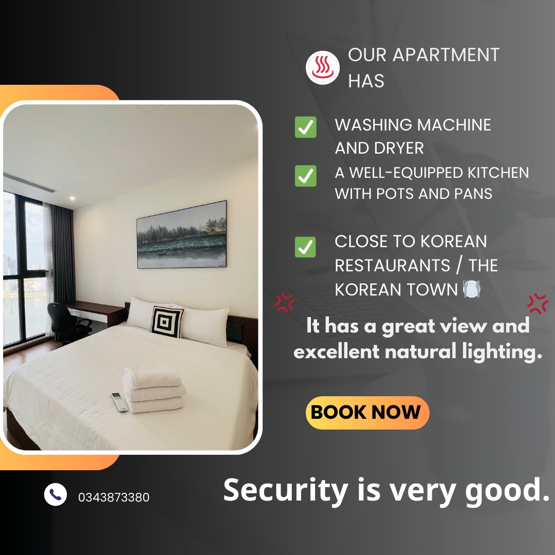Căn hộ bạn sẽ ở - Irene home __Vị trí: Vinhomes SkyLake tại số 50 đường Phạm Hùng, Quận Nam Từ Liêm - Vị trí trung tâm thuận tâm thuận tiện di chuyển tại Hà Nội. __Đối diện là khu phố Hàn Quốc, vui chơi, mua sắm: The Manor, Đình Thôn (Cách 300m). Kế bên toà nhà Landmark 72 - Keangnam Tower (Cách 200m) đầy đủ dịch vụ mua sắm. ✔️Tiêu chuẩn căn hộ cao cấp, sang trọng và tương đương khách sạn 5 sao. ✔️Có người dọn dẹp phục vụ theo ngày. Tôi luôn hỗ trợ quý khách 24/24 nên xin hãy liên hệ với tôi 💕