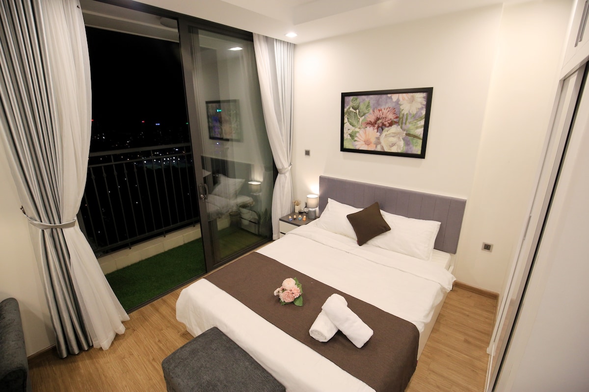 This is a spacious studio apartment located on the 22nd floor of block C2, D’Capitale Complex. With an area of 35m2, the apartment with wooden floors creates a cozy but still airy feeling with a large balcony. Beside the queen bed, the apartment has 1 bookshelf, a large sofa, and a dining table for 2 people. The kitchen is fully equipped with kitchen utensils, suitable even if you have a long stay. The apartment also has a smart SAMSUNG TV with Netflix and fast internet for remote working.