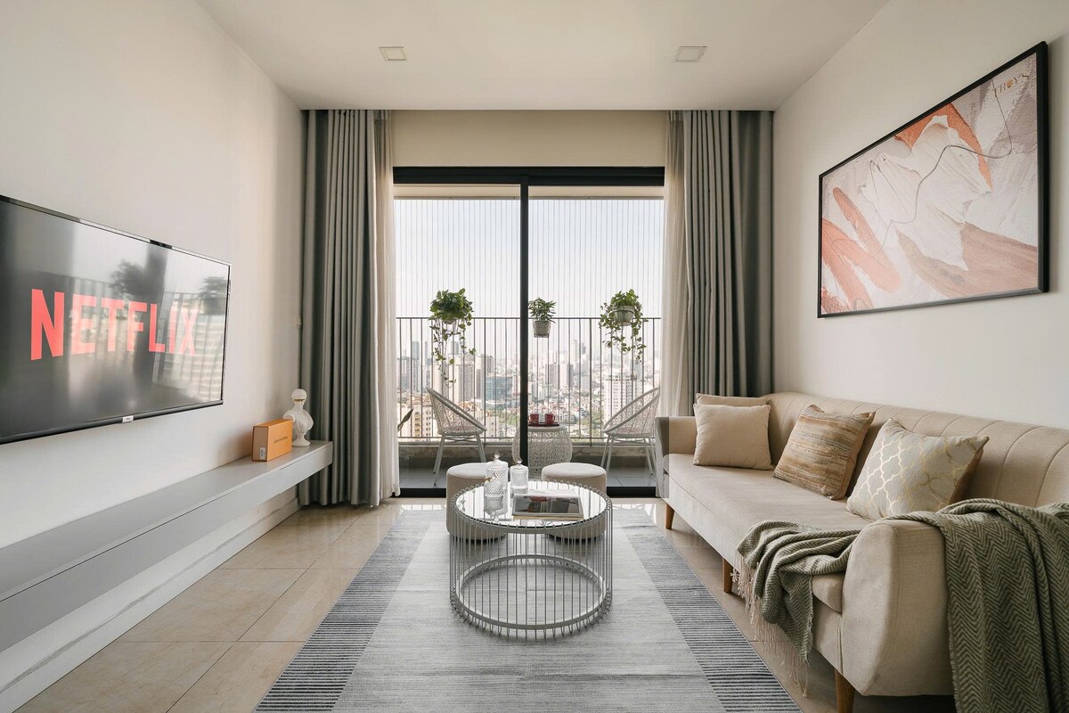 This is a spacious studio apartment located on the 22nd floor of block C2, D’Capitale Complex. With an area of 35m2, the apartment with wooden floors creates a cozy but still airy feeling with a large balcony. Beside the queen bed, the apartment has 1 bookshelf, a large sofa, and a dining table for 2 people. The kitchen is fully equipped with kitchen utensils, suitable even if you have a long stay. The apartment also has a smart SAMSUNG TV with Netflix and fast internet for remote working.