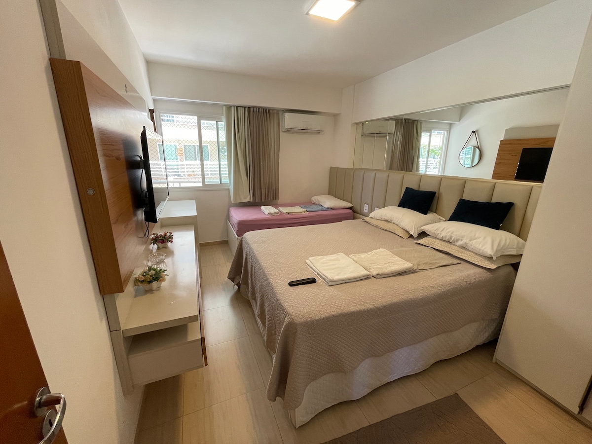 Apartamento bangalô térreo com vista frente mar. O apartamento com 01 Suíte + Demi-suíte ambos com ar-condicionado, cama de queen e roupas de cama e banho de ótima qualidade. A cozinha completa de utensílios e com os principais eletrodomésticos, na área de serviço com tanque e máquina de lavar. O condomínio oferece uma enorme piscina, sauna e jaccuzi, quadra de tênis em saibro e poliesportiva, academia, espaços lounge, grande área verde, loja de conveniência e restaurante