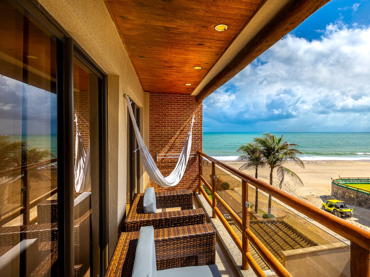 Stay at the closest spot to the beach 🏖️ in Cumbuco. Open your windows🪟 and enjoy the ocean breeze 🌬️and the sound of the waves 🌊directly from your bed🛏️. Spacious apartment (119 m²) directly on the beach in Cumbuco. 2 bedrooms, 2 bathrooms, large living room everyone with AC and big terrace with direct pool access. Perfect for long stays with a europe washing machine, big fridge, and private kite locker. Enjoy stunning views and relaxation on your private terrace
