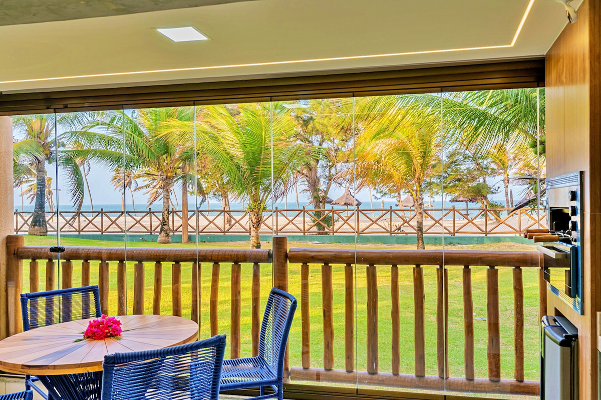 The top Cumbuco condo. Beach front, near to the city downtown, quiet place, with parking space and 24-hour security. Wonderful apartment with 2 bedrooms with blackout curtain. 1 suite with balcony, queen bed. 1 bedroom with 2 beds, social bathroom with shower. Living room with sofa/32' smart tv, wi-fi fiber, table for home office, full American kitchen, washing machine, large balcony with dining table, sofa, hammock, awnings (front/side) and a breathtaking view