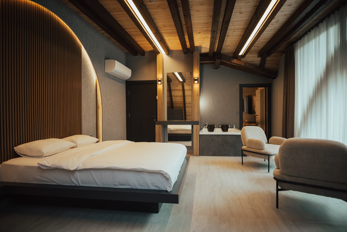 可容纳四人的大型木制房间,可欣赏塞万湖的美景