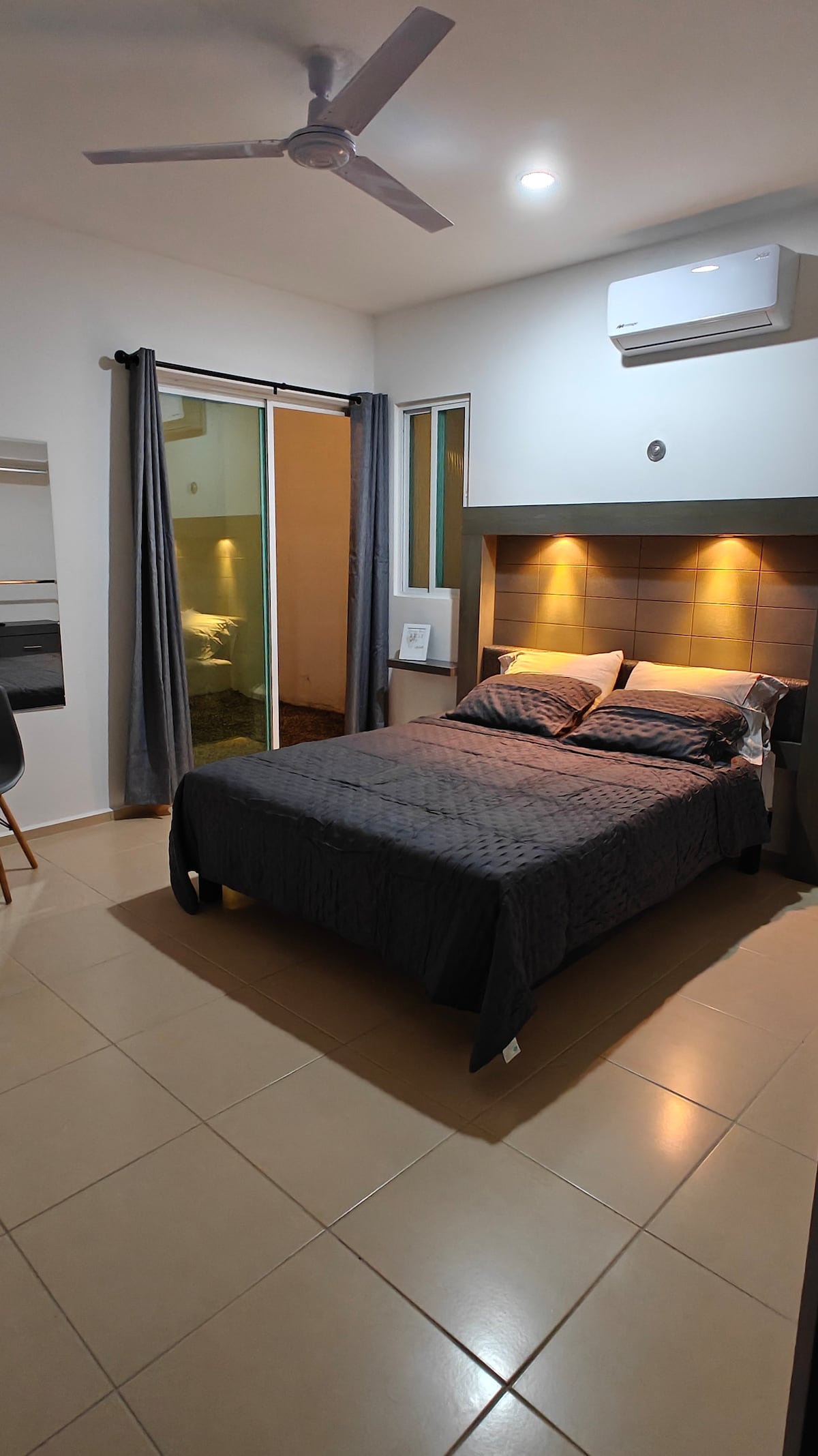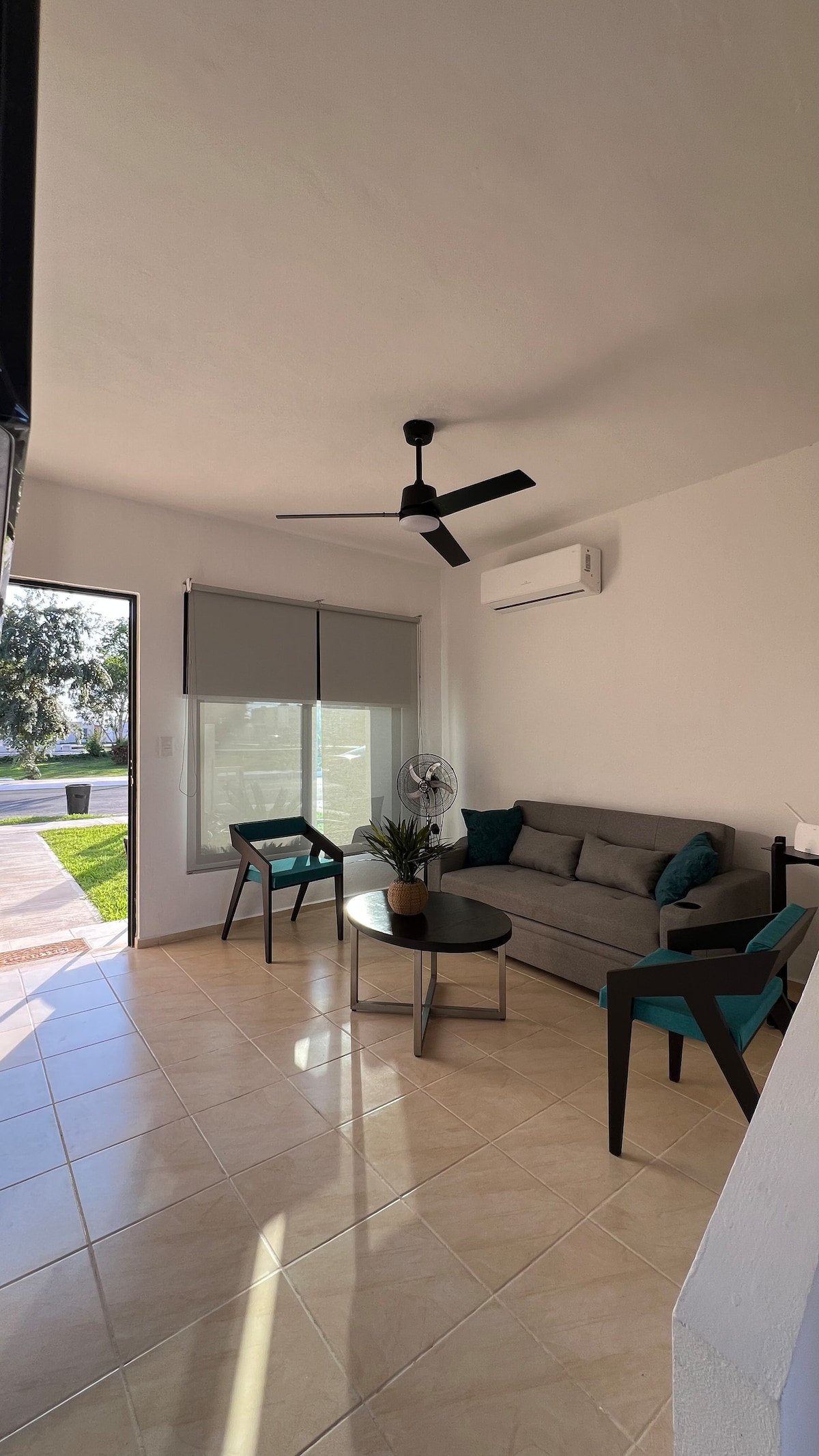 A contemporary private house with a touch of old charm in a quiet street and walking distance from Paseo de Montejo and the Main Square. Plenty of natural light filters throughout the house thru hidden ceiling skylights. Rooms have ceiling fans and AC wall units, plenty air ventilations as well throughout screen window doors.