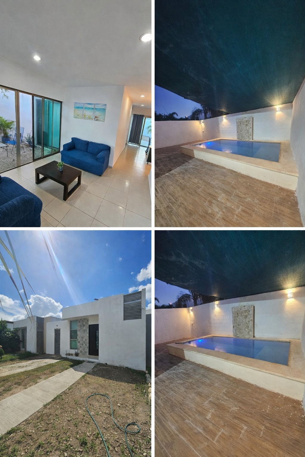 Se renta casa completa por día, semana ó mes, para cuatro personas, sala, comedor climatizados, dos habitaciones, con WIFI, pantallas smart, agua caliente, aire acondicionado, baño y medio, cuenta con Cocina, sala, comedor, alberca. La casa se encuentra en una privada residencial con dos parques a 30 minutos de progreso y a 20 minutos de la zona centro de Mérida. La casa se encuentra completamente climatizada, cuenta con un aire de 2 toneladas en sala comedor, en las 2 habitaciones su clima