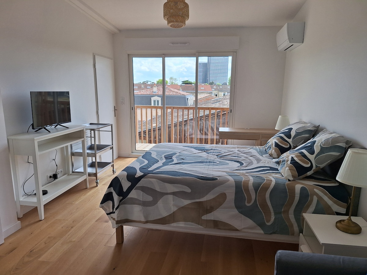 In the center of Bordeaux this nice 2 rooms of 46m2 welcomes you in very comfortable level. The decor is neat, quality amenities, queen size bed (160x200) with comfortable mattresses. The large balcony with a beautiful view of the place Gambetta and the rue du Palais Gallien will allow you to lunch in the sun. Very close to Place Gambetta (pole exchange transport) you will be 5mn of the tram and bus B # 1 (direct airport / station) check in 2:00-7:00pm. No late check in