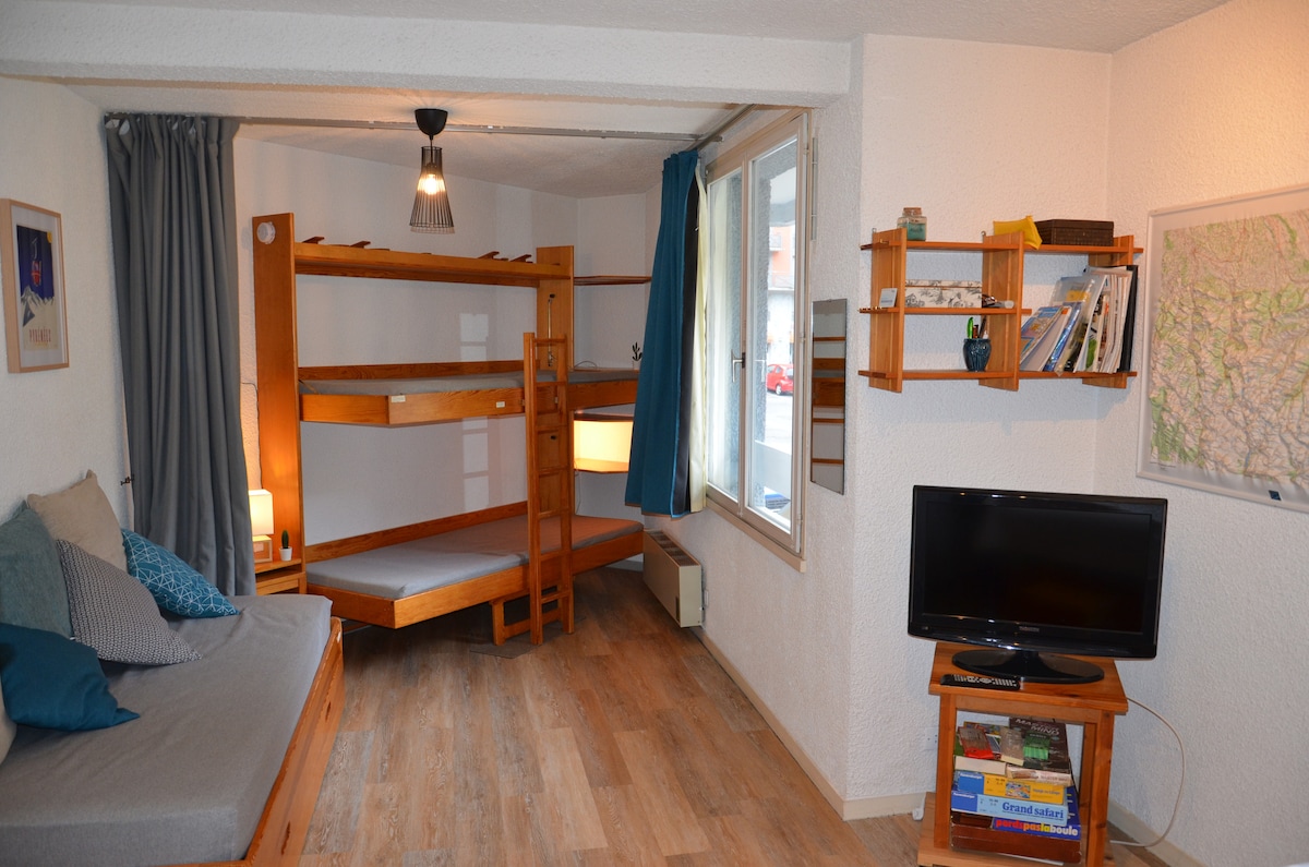 Studio 4 pers. 28m2, parfait état, bien équipé Entrée: 2 lits superposés en 90, SDB, toilettes, séjour équipé d'un canapé lit 2 places. Coin cuisine avec plaques vitrocéramiques, micro-ondes, lave-vaisselle, réfrigérateur, appareil à raclette, vaisselle, cafetière à filtres TV, console de jeux, WiFi gratuit Piscine collective intérieure et salle de fitness ouvertes saison hiver et été (15/06 au 15/09) du lundi au samedi de 10h à 19h parking extérieur Balcon/terrasse Casier à ski au RDC