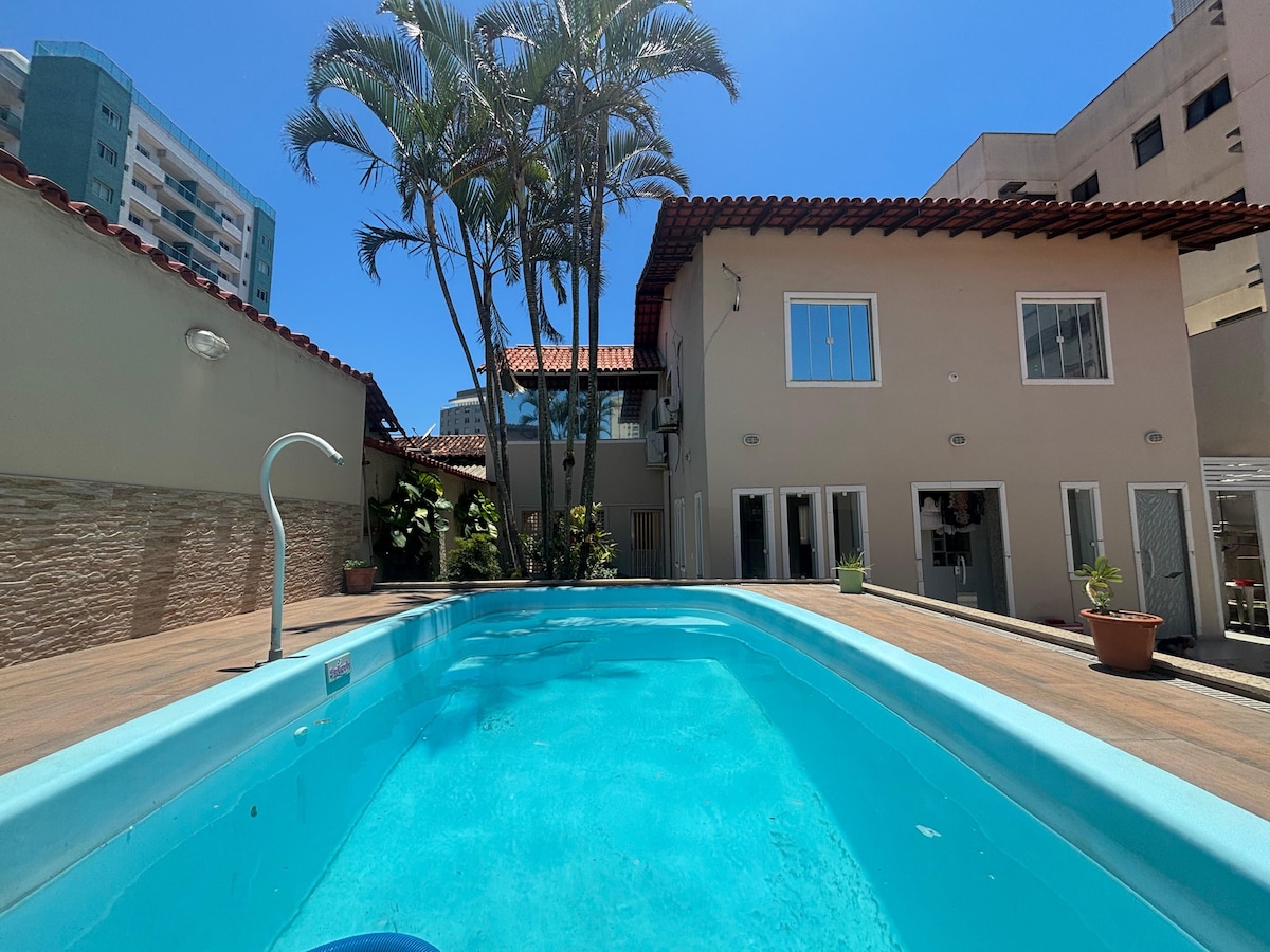 *3 minutos a pé da praia* WIFI POTENTE GARAGEM - 2 CARROS 3 quartos, 1 suíte, sala de tv smart. ar condicionado em todos os quartos e ventilador! espaço home office. Churrasqueira, área de lazer completa, piscina, jardim, espaço gourmet. enxoval: roupa de cama e banho disponíveis. Utensílios disponíveis. Localização: Área nobre da Costa do Sol, a uma rua da praia em rua familiar, próximo a restaurantes, padarias, conveniência 24h e academia. pet friendly!!
