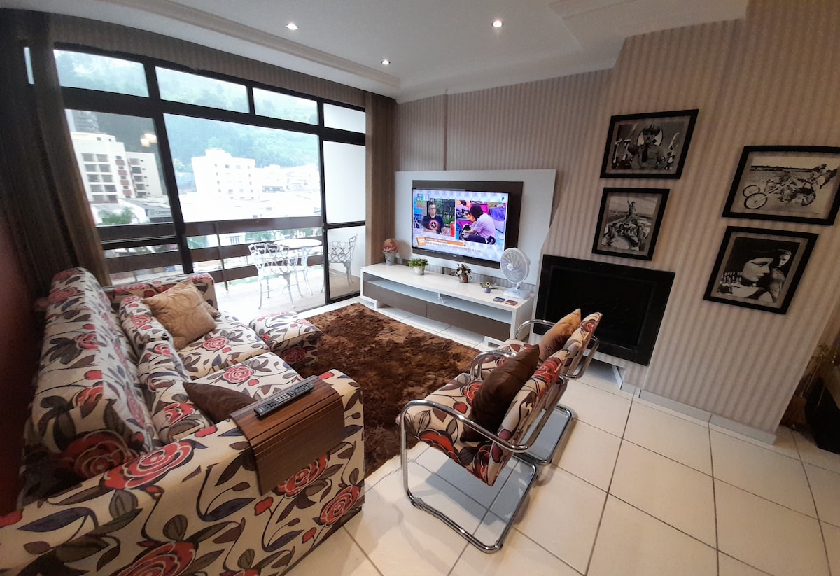 Sofisticado, aconchegante e romântico, localizado no centro. Finamente decorado e equipado. Apartamento diferenciado, com uma confortável suíte com cama queen e TV. Segundo quarto com duas camas de solteiro. Amplo banheiro social com ducha. Living com Smar TV de 55" e lareira. WiFi. Varanda com vista para a cidade e montanhas. Sala de jantar aconchegante e aquecedor. Cozinha planejada com lava-pratos. Despensa completa com lava-roupas. Ideal para uma estadia romântica ou com a família.