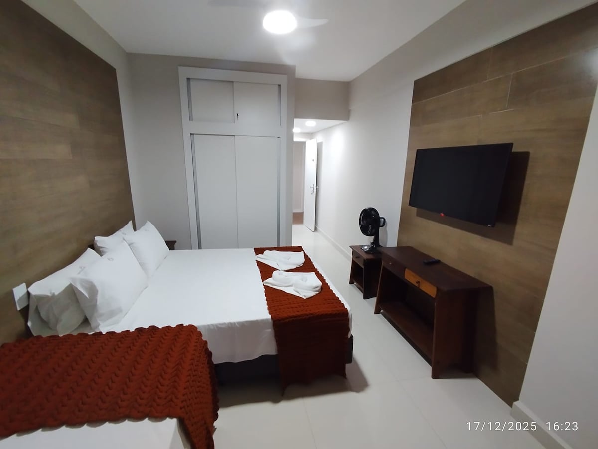 Taxa de hotelaria: 1 diária valor por pessoa $ 50 Acima de 2 diárias valor por dia/pessoa $25, criança até 12 anos não Paga. pago no Check-in na recepção do Flat O flat acomoda até 4 pessoas(independente da idade) condomínio perto do centro da cidade, ruas arborizadas perfeito para desfrutar. Microondas; Frigobar; Tv smart;Ventilador de teto; cafeteira, secador de cabelo e sanduicheira. Piscina climatizada, Brinquedoteca, Estac, WiFi no flat, Quadra de Tênis,Campo de Futebol e sauna.