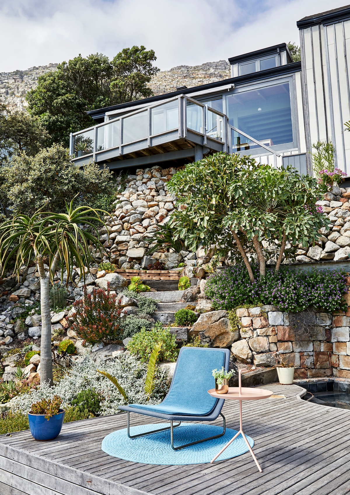 Our studio apartment opens up onto a 40sq meter balcony with a panoramic view of the Hout Bay Valley and the Helderberg mountains beyond. Large sliding doors disappear into the walls creating an unimpeded indoor/outdoor flow while the elevated position protects your privacy. The open plan bathroom faces onto an enclosed secret garden which includes a frame-less glass shower. The unit has a fully equipped kitchenette and is serviced daily except weekends and public holidays.