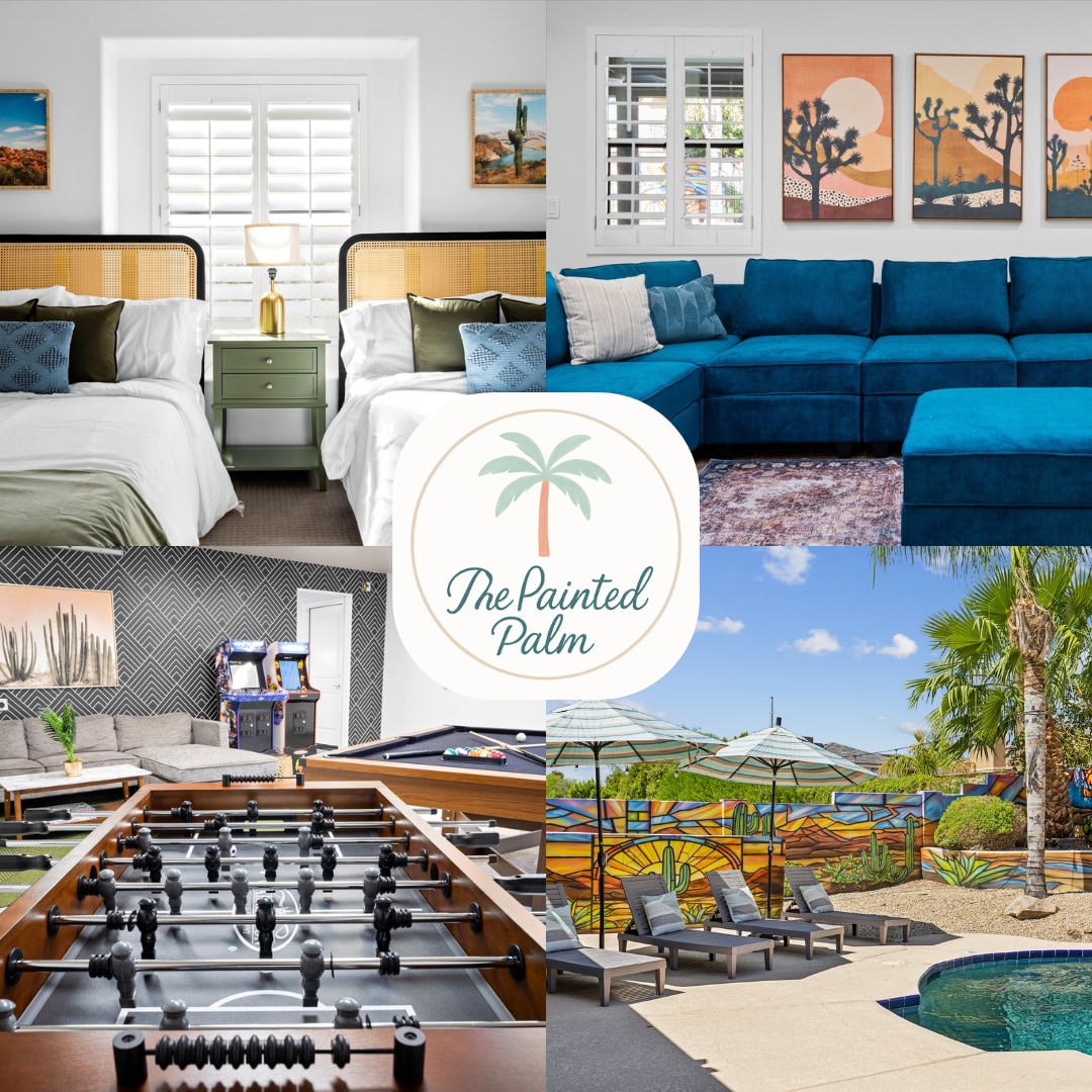 Welcome to "Villa Omnia," your perfect getaway with an outdoor kitchen, heated pool, bocce ball court, putting green, and various outdoor seating areas! The chef's kitchen opens to a spacious great room with two seating areas and an island bar. There are two ensuite bedrooms and two additional bedrooms with multiple beds. An office space with a pullout sofa bed accommodates extra guests. Host events like masterminds, retreats, and pre-wedding groups, all just 12 minutes from Old Town!