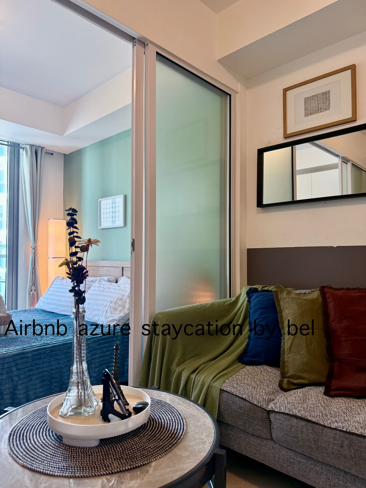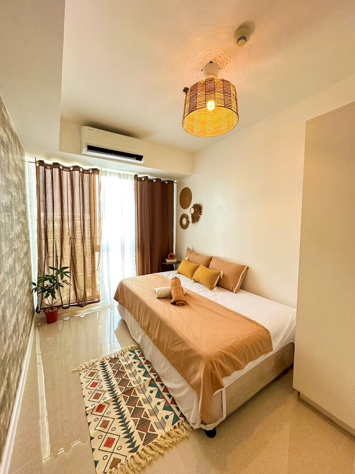Stay in the center of the action in this one-of-a-kind place. Near to everything that you need. A very nice place to stay, hangout or just chill. * Aircondition * 65-inch TV * Soundbar Speakers w/ Subwoofer * WiFi * Air Purifier * Bed Size Double 54x75 * Pull-out Bed size twin KITCHEN * LG Refrigerator 7cuft. * Induction Cooker * Microwave Oven * Electric Kettle Pots & Pans * Kitchenwares & Utensils * Dinnerware BATHROOM * Single Point Water Heater * Fully Automatic Washing Machine