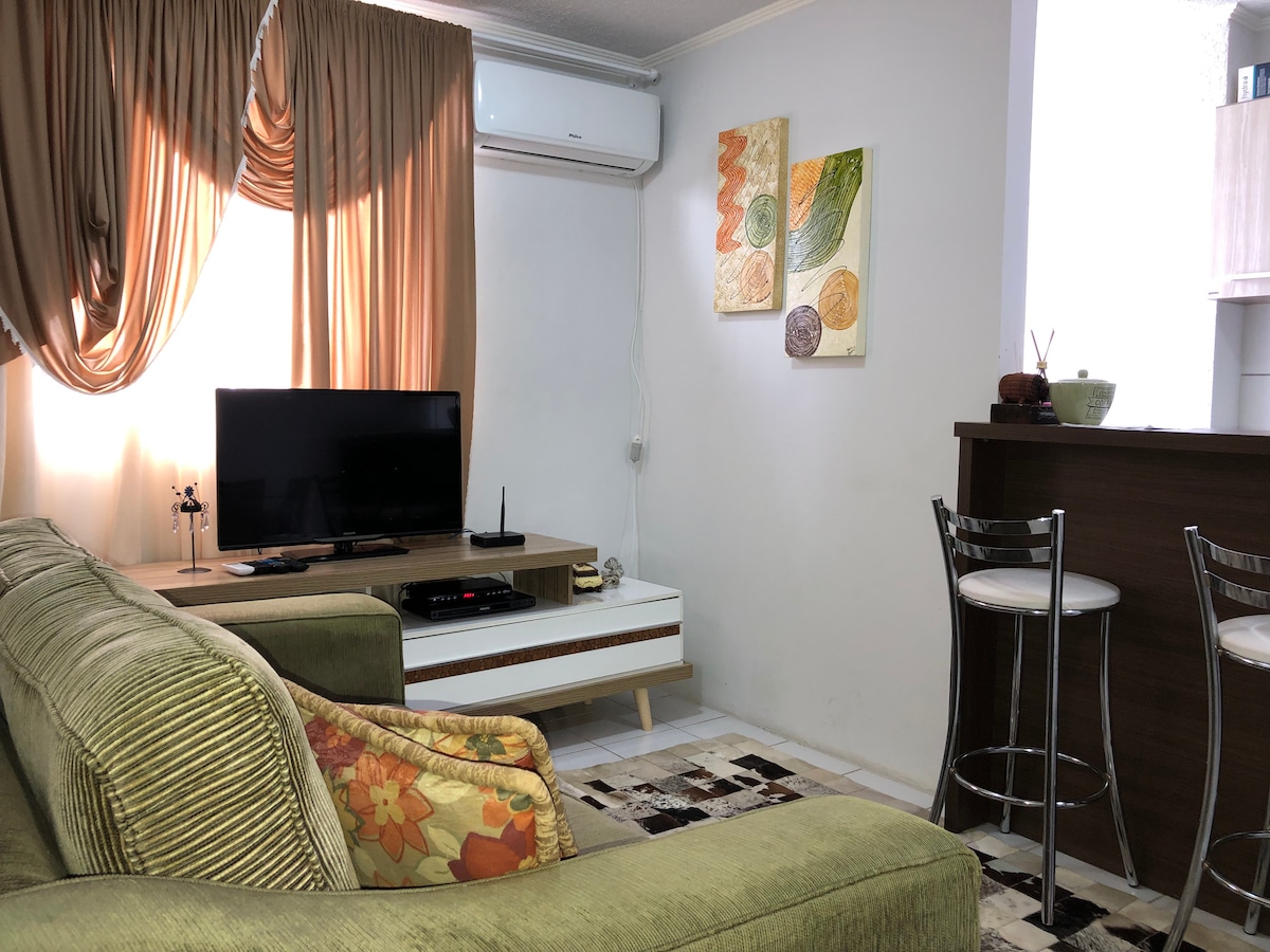 Apartamento amplo e confortável com tudo que você precisa para se sentir na sua própria casa. Possui internet de 300MG, tv de 65 polegadas, todos utensílios de cozinha e roupas de cama.
