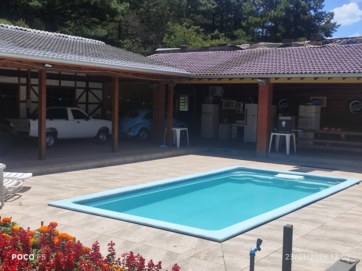 Chácara ideal para curtir com a família e amigos. Casa principal com 5 quartos, 3 banheiros, lavabo, cozinha, sala de jantar, ampla varanda, internet + wifi + smartTV e uma vista incrível. Na área da piscina temos o quiosque com churrasqueira, sala de jogos (sinuca,Ping pong) e banheiro. Campo de futebol, piscina e açude completam a propriedade. Situada a 5km do Santuário de Caravaggio em Farroupilha e a 10 minutos do Shopping Iguatemi em Caxias do Sul, estrada completamente asfaltada.