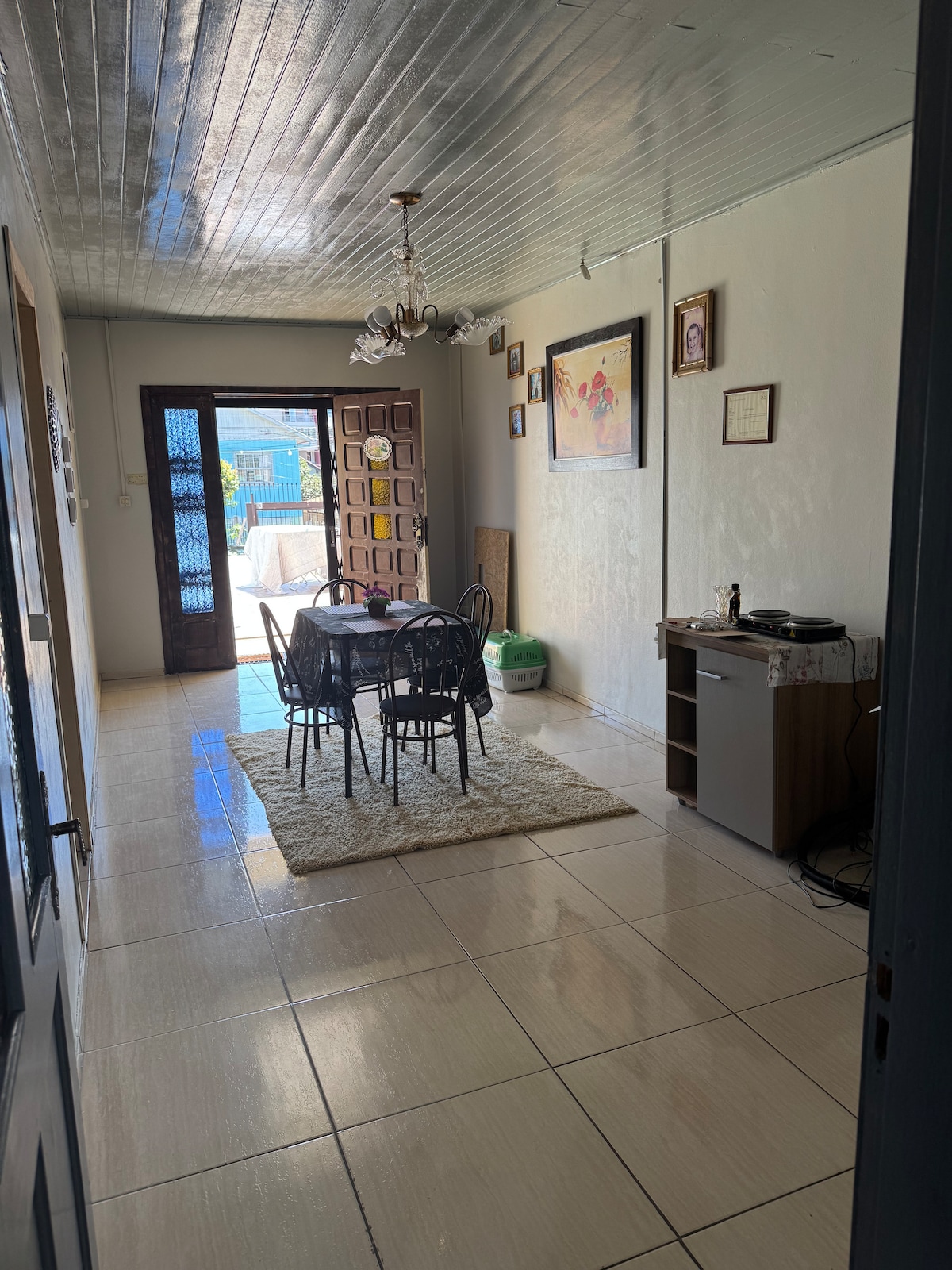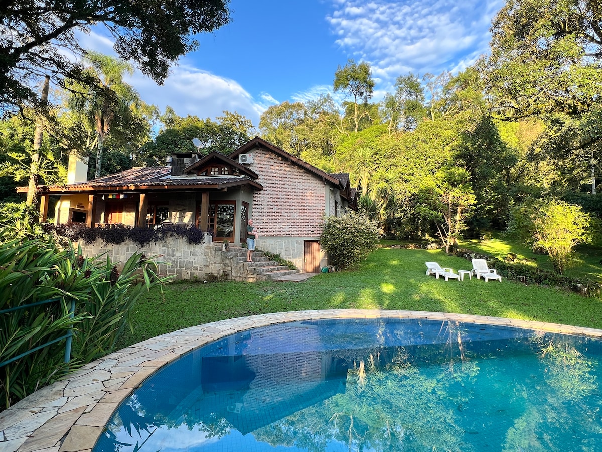Casa térrea com espaço privativo para os hóspedes, composto de um quarto com cama casal e um sofá cama, equipado com ar condicionado.Sala com lareira, Smartv 32', sofá cama para duas pessoas, cozinha com mesa de jantar e utensílios básicos, lav com tanque e máquina. Banheiro com chuveiro a gás/ elétrico. A casa fica num condomínio f/ com portaria 24 h. Segurança e tranquilidade, em meio a natureza e a 4 km do centro de Gramado. Há espaço para estacionamento de dois carros dentro no pátio.