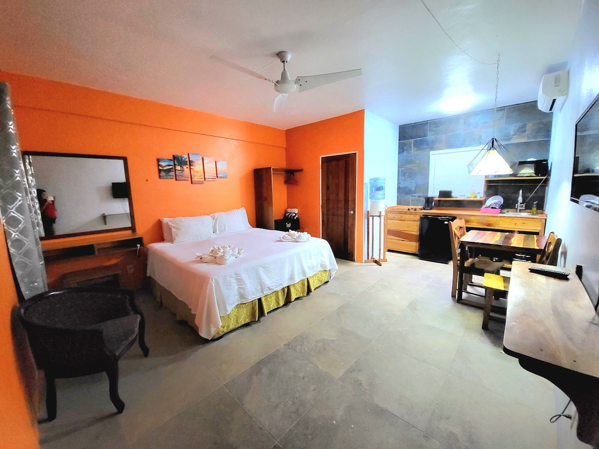 This pool side studio is conveniently located close to the center of the Island yet far enough from the crowd. It's fully furnished equipped with a split unit A/C , ceiling fans, complementary Wi-Fi, hot and cold water, private bath, king size bed & full kitchen. With full access to our pool, outdoor patio & roof top for an amazing view. There is also a 2 bed 2 bath available onsite for larger groups or families. Come and enjoy!!