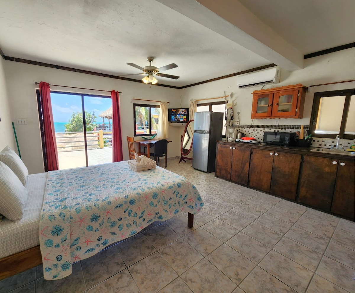 Forget your worries in this spacious and serene spot on the ocean in Caye Caulker. Located on a huge private fenced spot on the South side just a couple of minutes from the Village. Lounge away in a hammock, on the sun deck, or on your patio facing the beach, sipping a nice beverage! Take a bike ride to the town for dinner or cook your catch at home. It's all about YOU! The suite is luxurious and comfortable @ 800 sq. ft. Basics to get you started are provided. 12.5% Govt tax due on arrival.