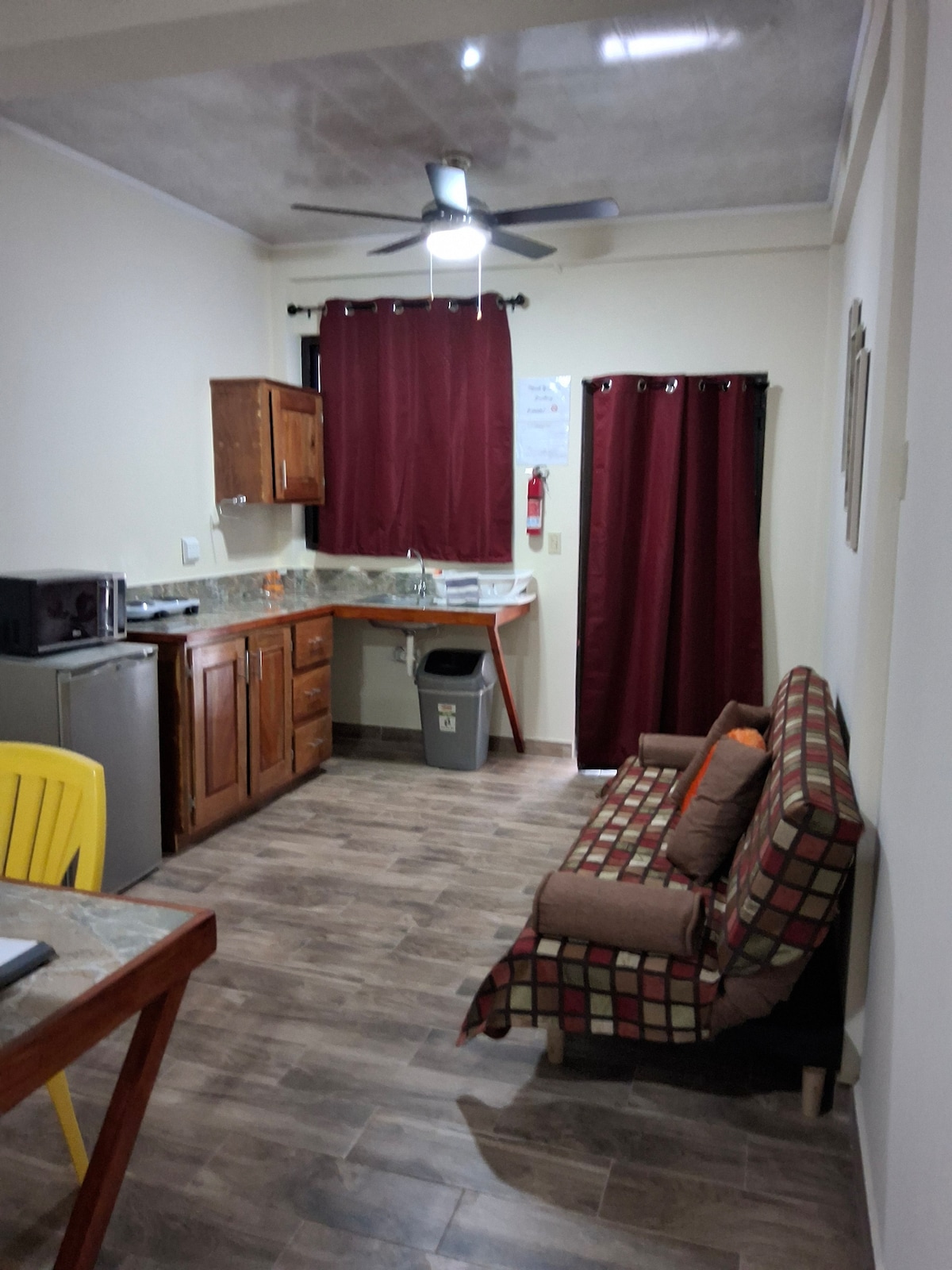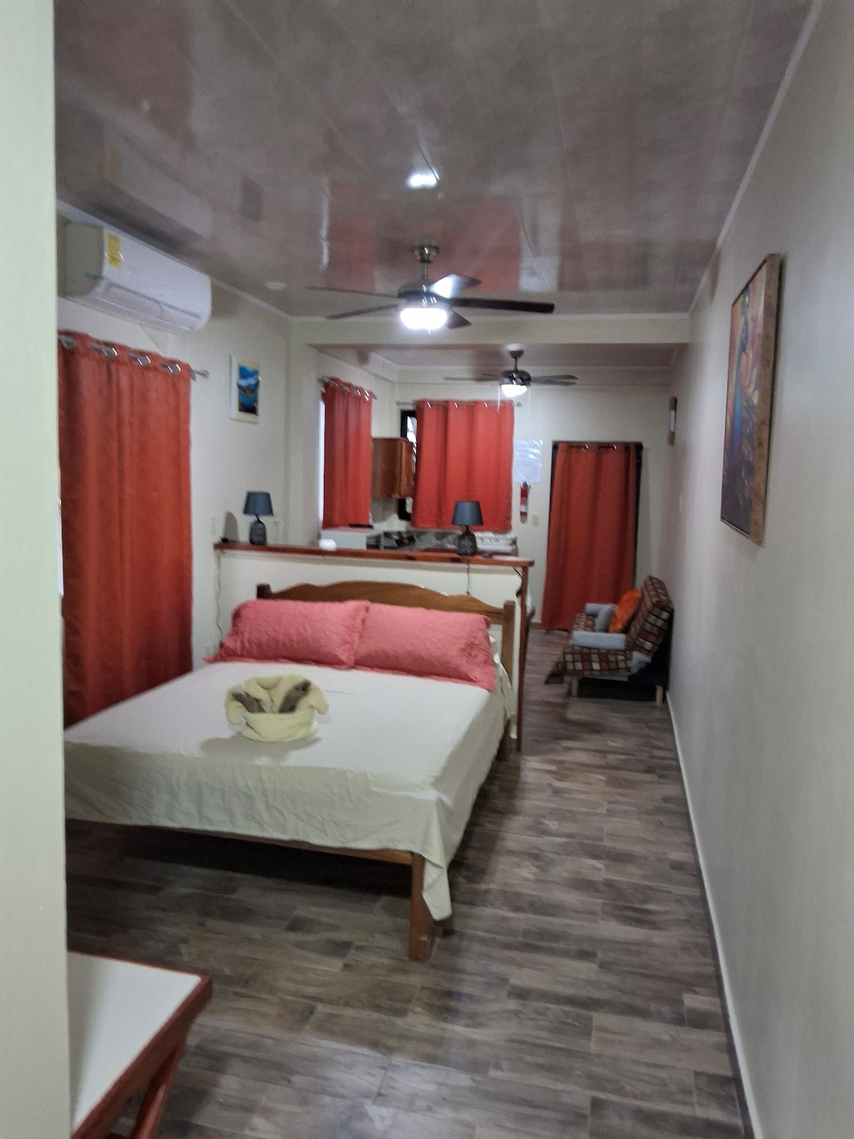 This Belize Vacation Cottage is tucked away just outside of the village. Walk to the sea, located at the end of our street, or head to the village, a 10 min walk along the beach. This cottage is an excellent budget friendly option for singles, couples, friends or small families. Aqua Villas Cottage A has queen loft bed and single bed in the livingroom with Smart TV.