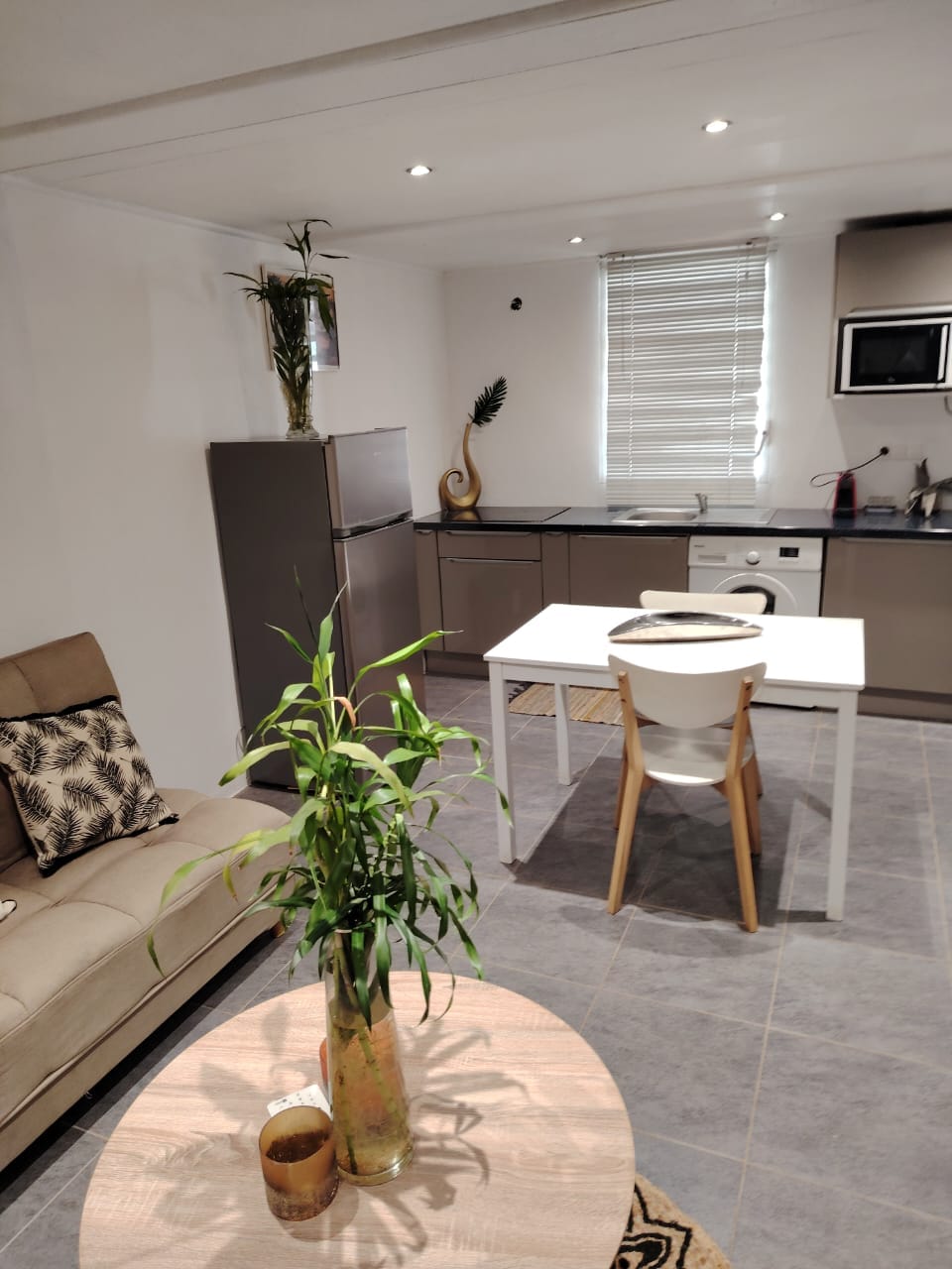 Appartement coquet, neuf , climatisé et vous détendre dans un lit king size avec TV et un grand canapé lit avec TV 65". Proche du bourg, de l'aéroport, d'un grand centre commercial à 20min. La terrasse de 15m2 pour les fumeurs avec un jacuzzi de 2 à 4 personnes et 2 parkings . La nuitée pour 4 personnes /min.1 nuit. A la semaine ou au mois, prix dégressif . Arrivée entre 13h et 21h/ départ entre 6h à 11h. L entrée et la sortie sont autonomes avec boîte à clés. Nous sommes classés 3 étoiles.