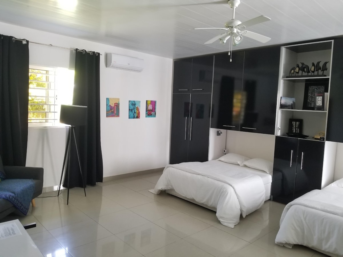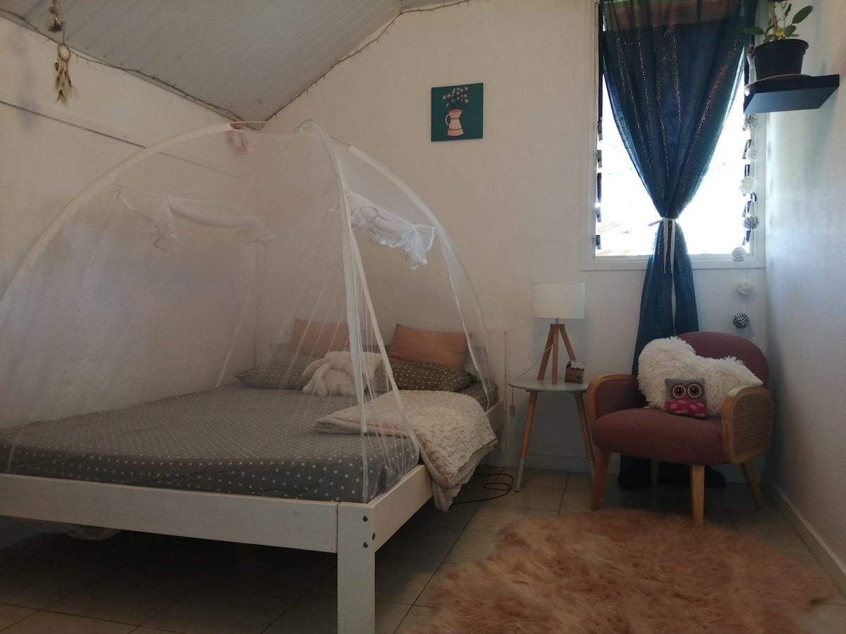 Situé à 5 km du centre ville de Cayenne, dans un quartier résidentiel de Remire Montjoly et à quelques mètres de la plage. Cette chambre d’hôte vous apportera tout le confort et le service d’un 4 étoiles. Composée d’une immense salle de bain avec douche à l’italienne, sèche cheveux, peignoir, savon La chambre de 35 m2 est équipée de 2 grands lits de 2 places, d’un téléviseur, d'un mini-bar, d’un bureau, de la wifi, d'une planche et fer à repasser, d'une machine à café.