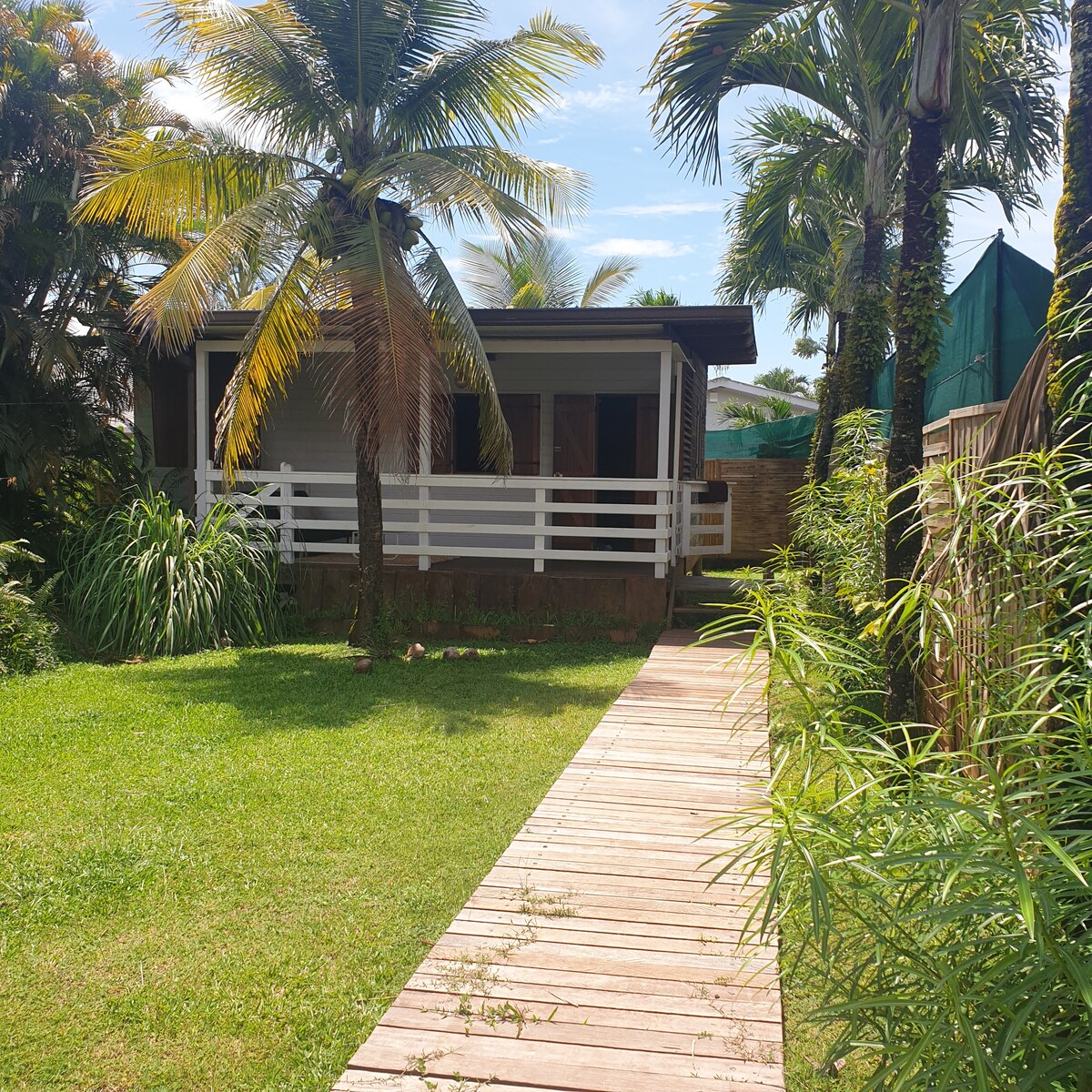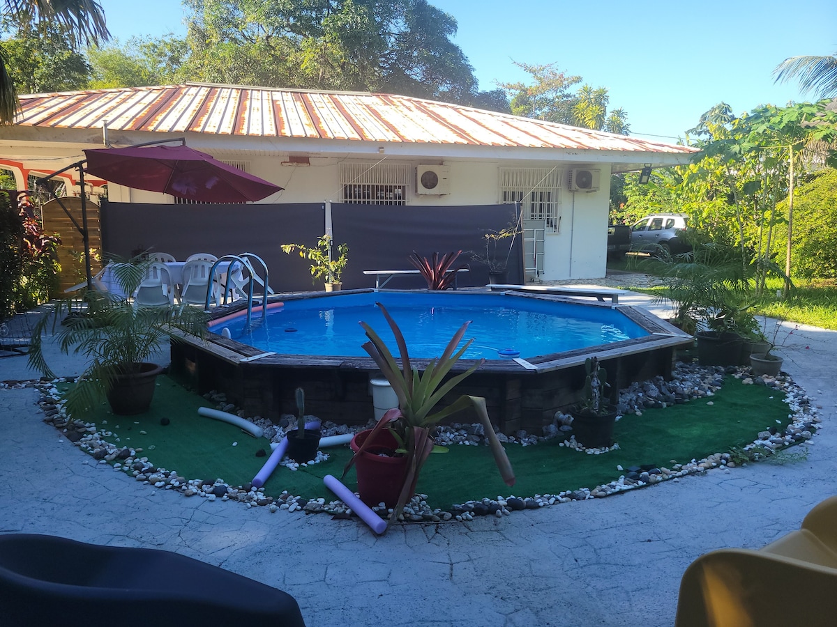 Carbet/maison en bois indépendant, avec deux chambres fermées, une terrasse extérieure, avec cuisine et salle de bain (avec eau chaude) ouvertes sur la forêt. Vous aurez accès à la grande piscine de la propriété et à un parking privatif (2 voitures max). Wifi par fibre optique Jardin fruitier et ornemental d'un hectare en permaculture. Endroit calme et reposant pour les amoureux de nature et de simplicité, où les morphos et colibris viendront régulièrement vous rendre visite.