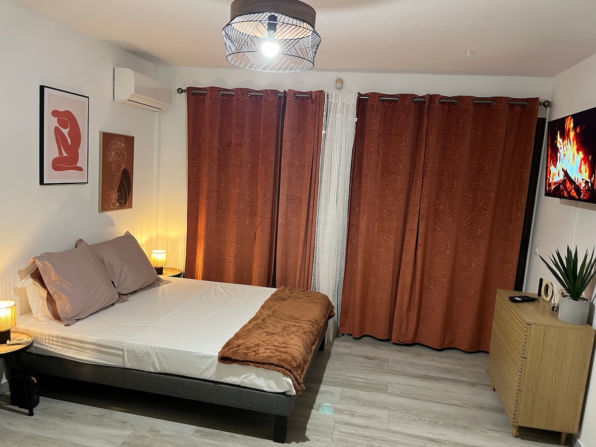 Studio climatisé de 25 m² avec cuisine indépendante, à 3.5 km de la place des Palmistes et 500 m de la plage de Montabo. Vous trouverez quelques commerces et restaurants à proximité. Le studio est mitoyen de notre maison et dispose d'une place de parking. Vous pourrez vous détendre sur une terrasse extérieure donnant sur une grande piscine au sel. Possibilité d'ajouter un lit parapluie pour un bébé. Nous n'acceptons aucune fête.