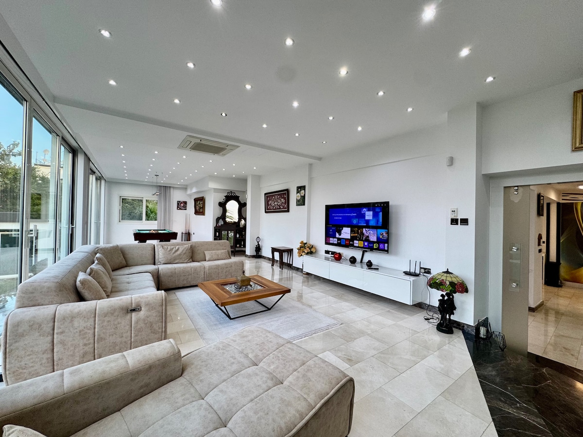 Villa in the TOP Airbnb, belongs to ancient Reinecke family. 5 minutes from the beach, aqua park and casino of Acapulco Hotel, 20 minutes to center of Girne. The house has large cinema, massage chair, luxurious marble furniture, panoramic views and free electric transport! This exquisite twin-villa (duplex) in gated complex with 3 pools has privat garden, font, ping pong, mangal, swing, trampoline and 2 fountains. Two shops, two restaurants and a cafe near the house. No parties allowed.