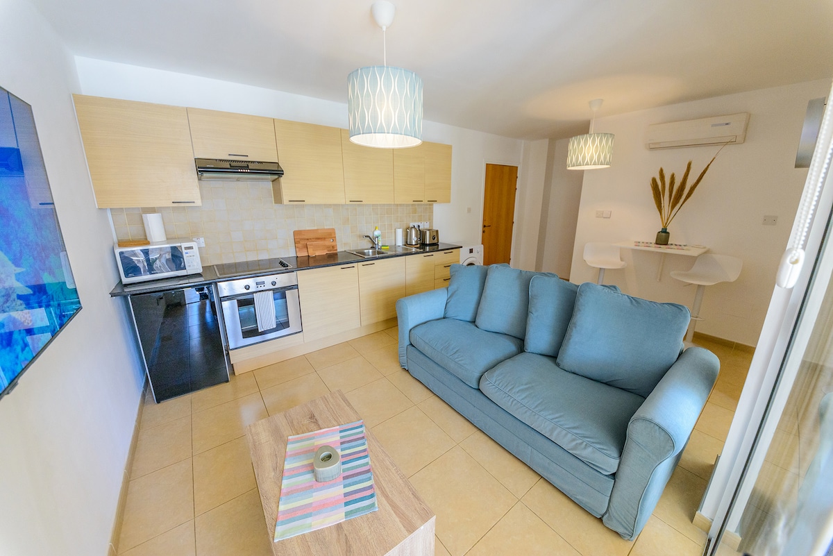 Apartment is 78 sq.m. and extends itself to 18 sq. balcony where one can enjoy great sights to the Mediterranean sea; it has 3 bedrooms and 2 bathrooms and is fully equipped with all the essentials. The wonderful Thalassa beach is located just few minutes walk from the apartment. Cosy "Deks" restaurant as well as Mini-market, Large outside pool, indoor heated pool, great Spa-center and Gym available on site. Larnaca and Ercan airports can be reached within 1.10 hour drive.