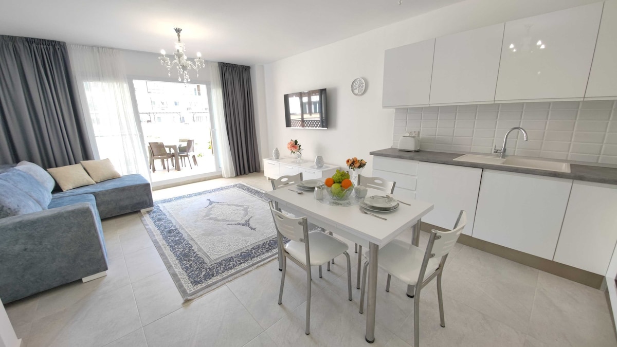Просторная современная квартира в минуте от аквапарка и 7 минутах пешком от чистого песчаного пляжа. Аквапарк, бассейны и вся остальная инфраструктура комплекса, включая зонтики и лежаки на пляже бесплатны для использования. В жилом комплексе есть магазин, ресторан, кафе, пекарня, пиццерия, спортзал, детские площадки, большая детская игровая комната, несколько бассейнов, крытый бассейн с сауной и хаммам, зона BBQ, охрана 24/7. Тихий живописный район, поблизости множество достопримечательностей.