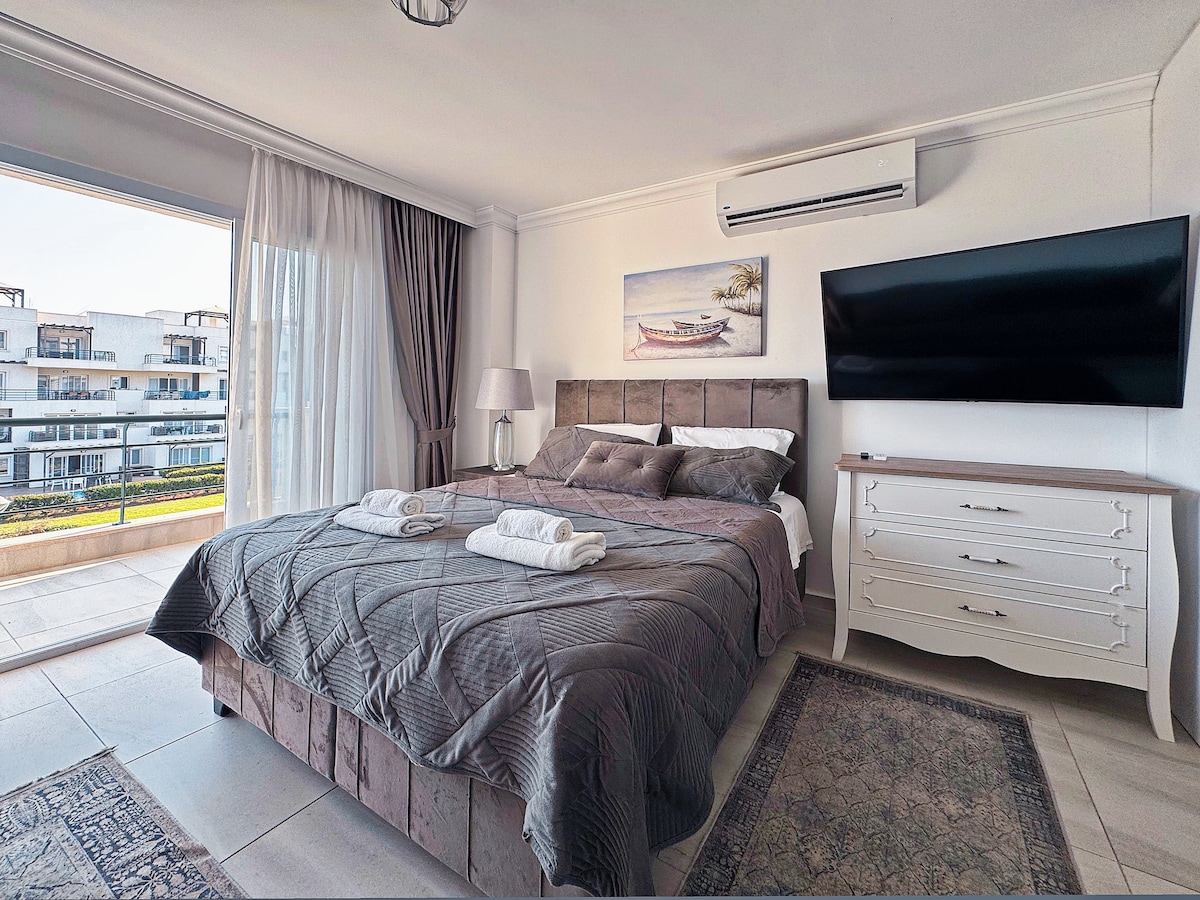 Просторная современная квартира в минуте от аквапарка и 7 минутах пешком от чистого песчаного пляжа. Аквапарк, бассейны и вся остальная инфраструктура комплекса, включая зонтики и лежаки на пляже бесплатны для использования. В жилом комплексе есть магазин, ресторан, кафе, пекарня, пиццерия, спортзал, детские площадки, большая детская игровая комната, несколько бассейнов, крытый бассейн с сауной и хаммам, зона BBQ, охрана 24/7. Тихий живописный район, поблизости множество достопримечательностей.