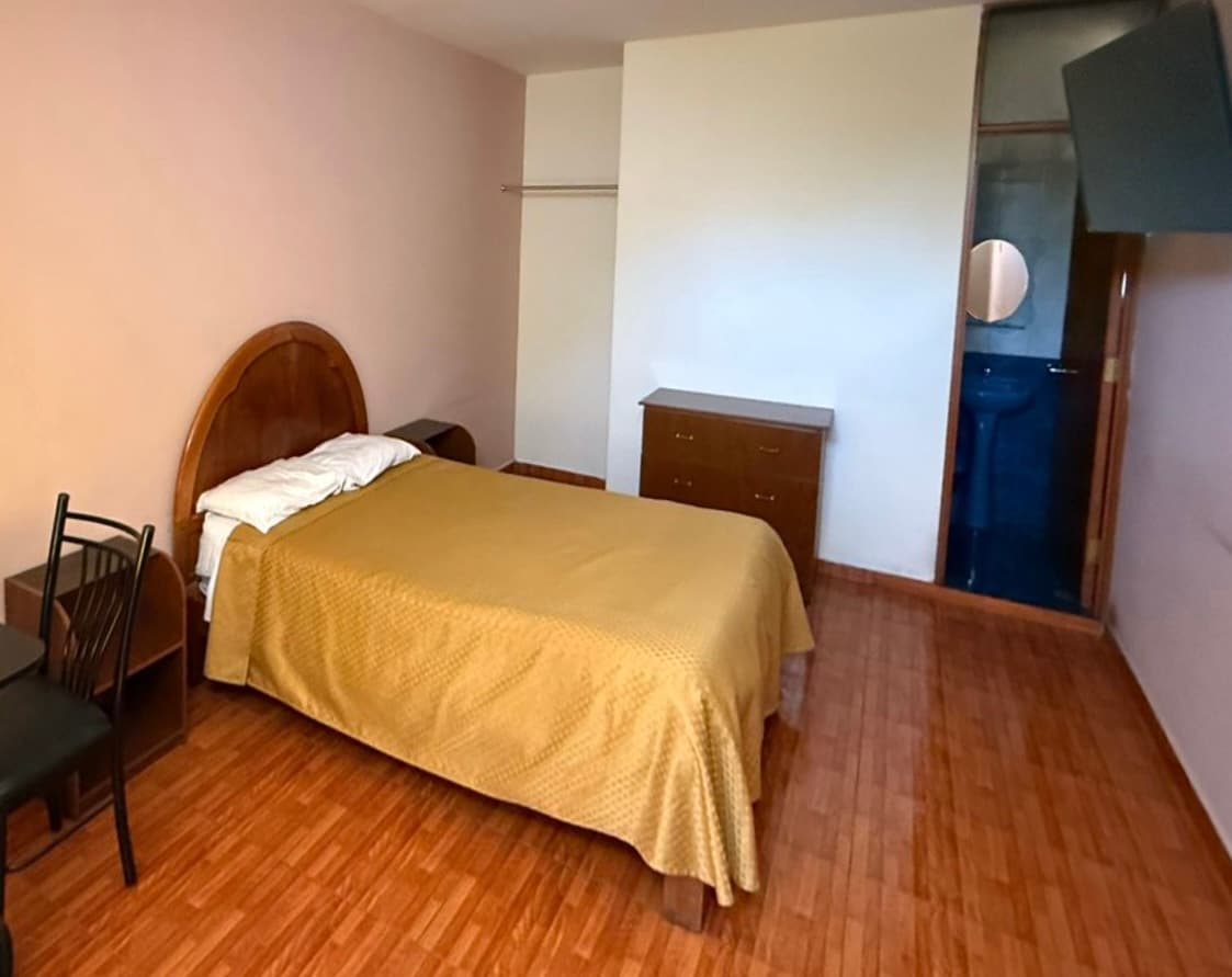 Habitación con 01 cama individual de 1.5 plaza, con baño privado dentro de la habitación. Wifi, Tv LED 32", baño privado, agua caliente 24 horas, limpieza de habitación e implementos de aseo (jabón, toalla, ph)