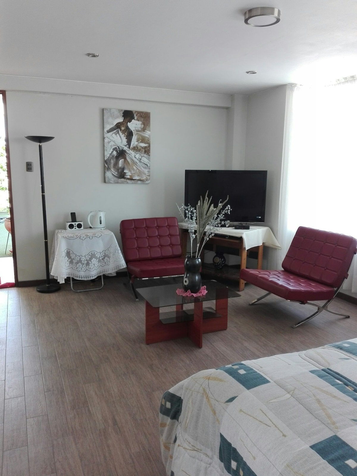 Encantador estudio privado monoambiente, 3° piso, sin ascensor, agua caliente 24 hrs, entrada independiente para huéspedes, la mejor ubicación en vecindario turístico y tranquilo. Espectaculares vistas desde amplias ventanas. A 3' minutos caminando del mirador y plaza de Yanahuara, supermarkets y restaurantes, a 20' caminando del centro histórico, a 15' en taxi del aeropuerto. Frigobar, microondas (sin cocina), hervidor, vajilla, mesa con 2 sillas, escritorio, pequeño tv con cable e internet.
