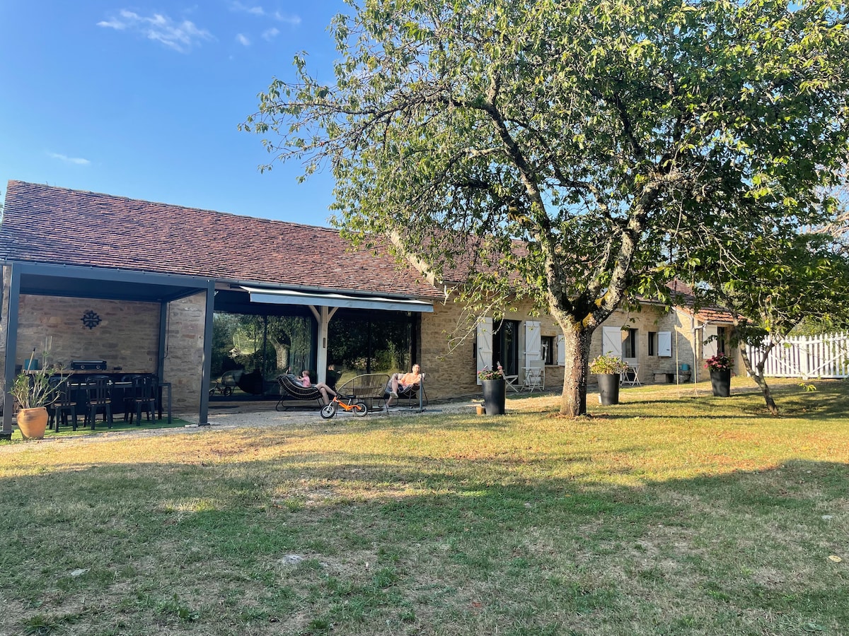 We offer our guests a lot of peace and space in a beautiful natural historically protected environment (Saut de la Mounine), 3 authentic stone houses from 1885, a private swimming pond, private parking, a large garden, furniture, barbecues, vegetable gardens, a herb garden, and a great view. We are happy to cook for you: breakfast, 3 course menu or a semi-prepared meal ready for you when you arrive. the beach on the river Lot is within walking distance, nice villages and markets to visit.