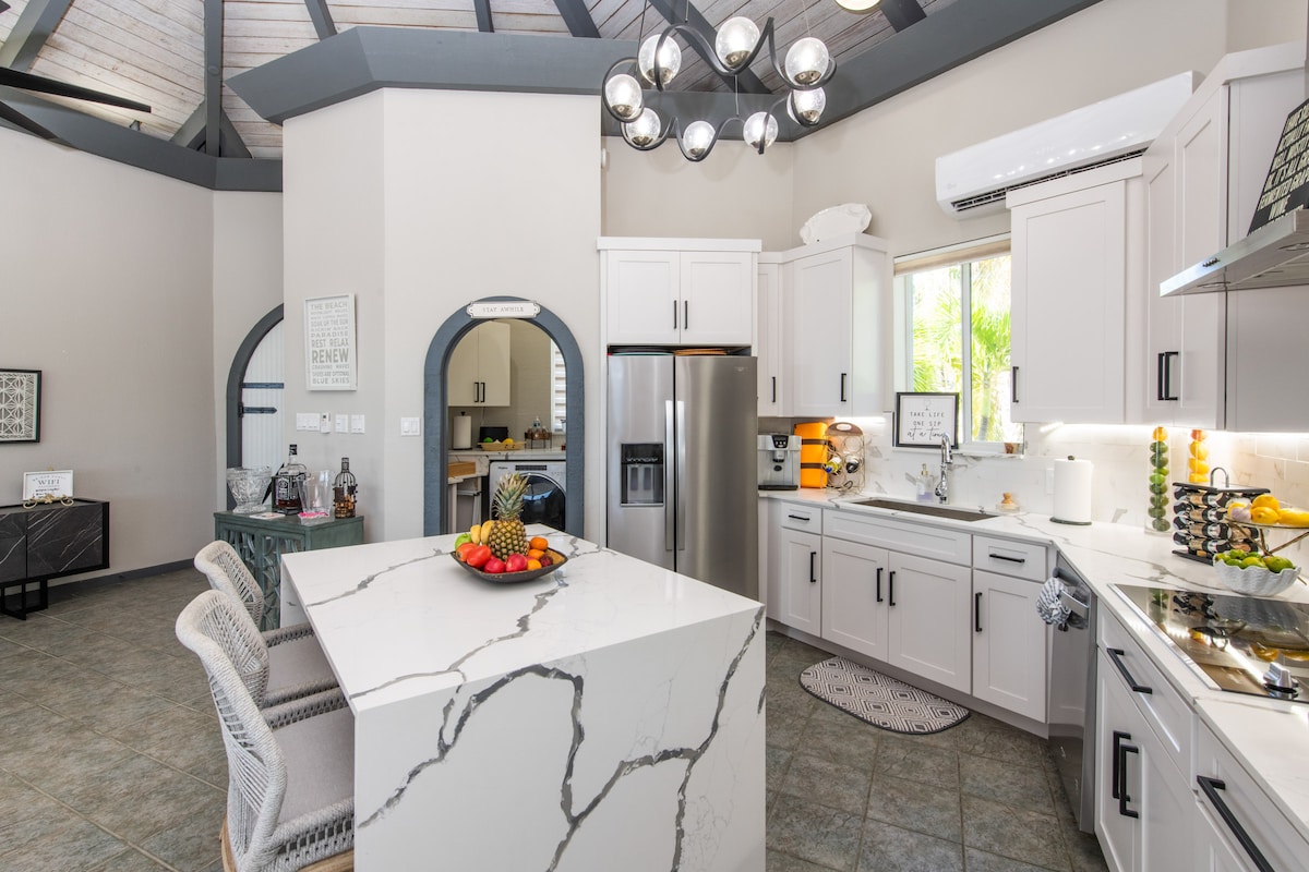 Heavenly Suíte #2 at The M @ The Edge is a studio apartment with sleek & modern furnishings, smart HD TV, sound bar, chandeliers, state of the art kitchenette with quartz counter-tops, Delta faucet, and under counter lights. The chic bedroom fashioned in white crisp tiles, scones and recessed lighting mimics the luxurious bath styled in porcelain & Carrera tiles, Delta faucets, mirrors. . The patio enlivened by red/white accents, greenery, bar, pergolas, and Jacuzzi.