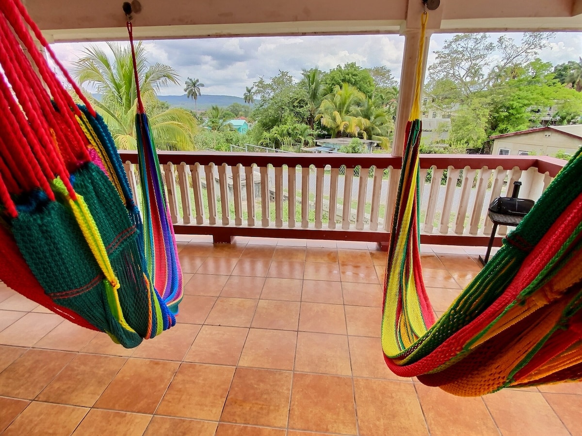 Welcome to our lovely home. The large bedroom with king sized bed comes with a hammock for you to relax in, as well as an ensuite bathroom for your privacy. We have 2 more (36x72) mattresses we can add upon request. We have a dining room, roof-top and balcony for you to enjoy. Enjoy your privacy and communal space as you prefer. Included is a Belizean breakfast freshly cooked for you at the time you desire!