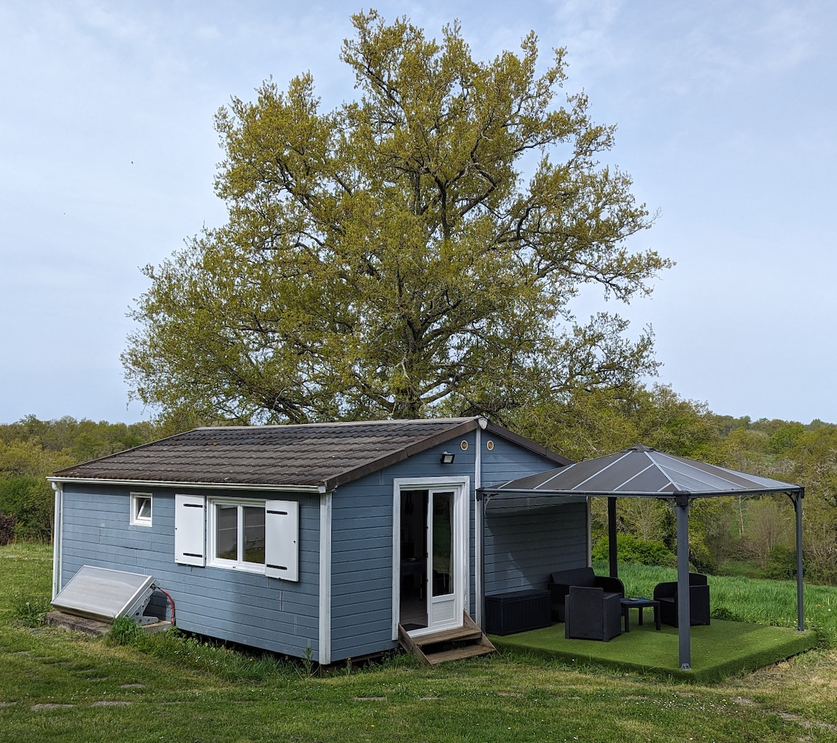 Petite maison de 20 m2 , en pleine campagne. Restaurée avec soin, elle comprend un séjour équipé d'un canapé lit 2 places, d'une kitchenette et d'une salle de bain chaleureuse type chalet. Elle dispose d'un poêle à bois. Elle profite d'un espace ombragé équipé d'un barbecue et d'un salon de jardin et d'un espace qui s'ouvre sur un large paysage de campagne. Un ruisseau longeant la praire, des chemins de randonnées et le village médiéval à proximité invitent à la balade .