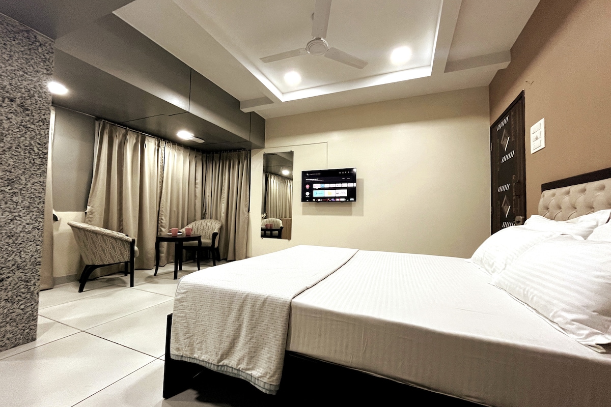 We want to provide you with a comfortable and relaxing stay. Let us give you a clear description of what our Suite offers. The living room is designed for relaxation, with comfortable couches and cushions in sharp color contrasts. It's bright and sunny, making it a great space to work or read. You can also enjoy entertainment on the flat-screen TV. The window view is magnificent, offering a great view of Navi Mumbai city, day or night.
