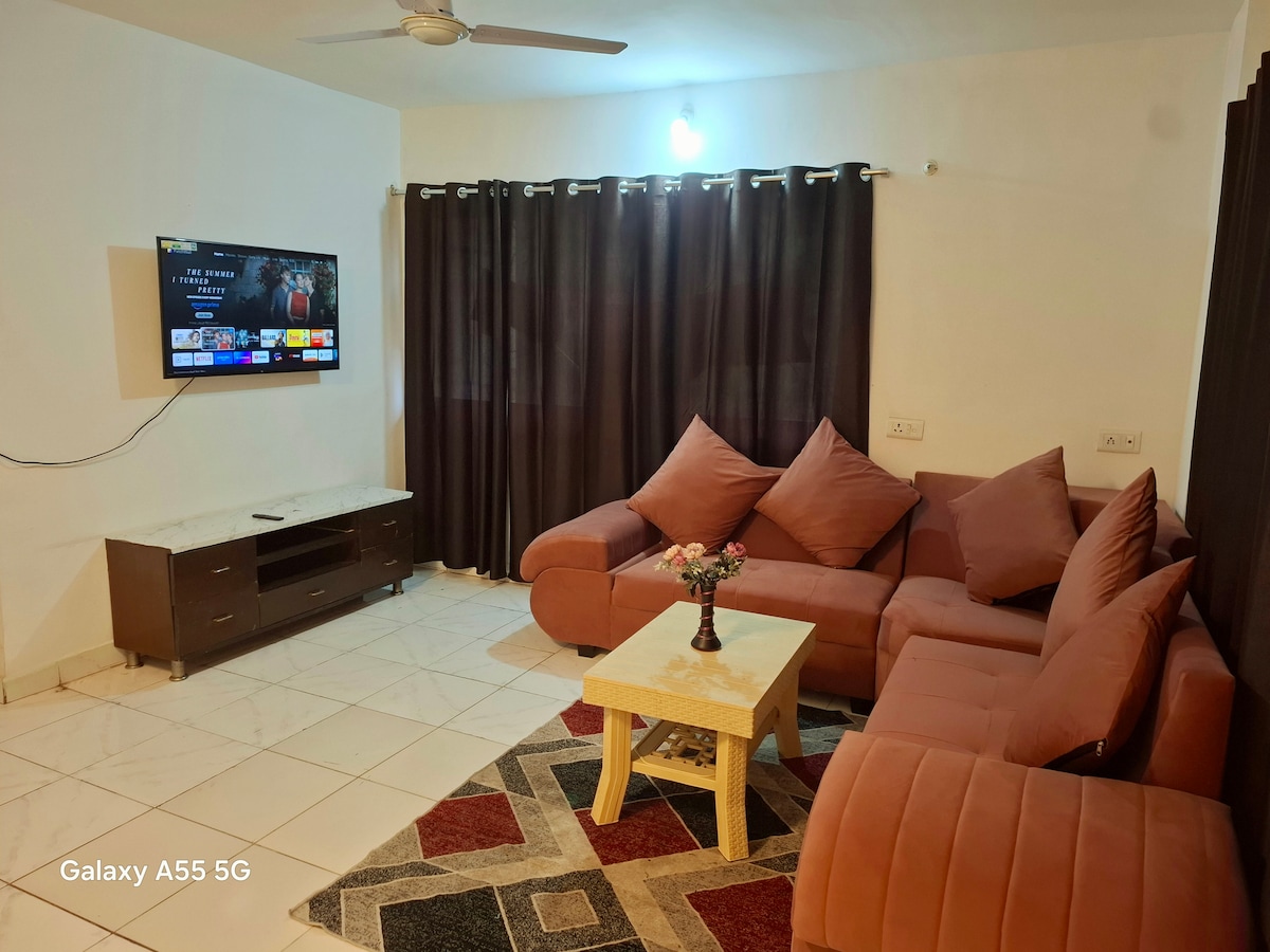 Stay in luxury at our fully furnished 1BHK apartment, offering a cozy bedroom, two bathrooms (one attached bedroom, one common ), and a fully functional kitchen with appliances and basic cooking utensils. Relax in the spacious living room with a big smart TV and elegant interior design. Enjoy high-end furnishings that create a home away from home. Perfect for both short and long stays, this apartment promises comfort and convenience in a prime city location. Book now for an exceptional stay!