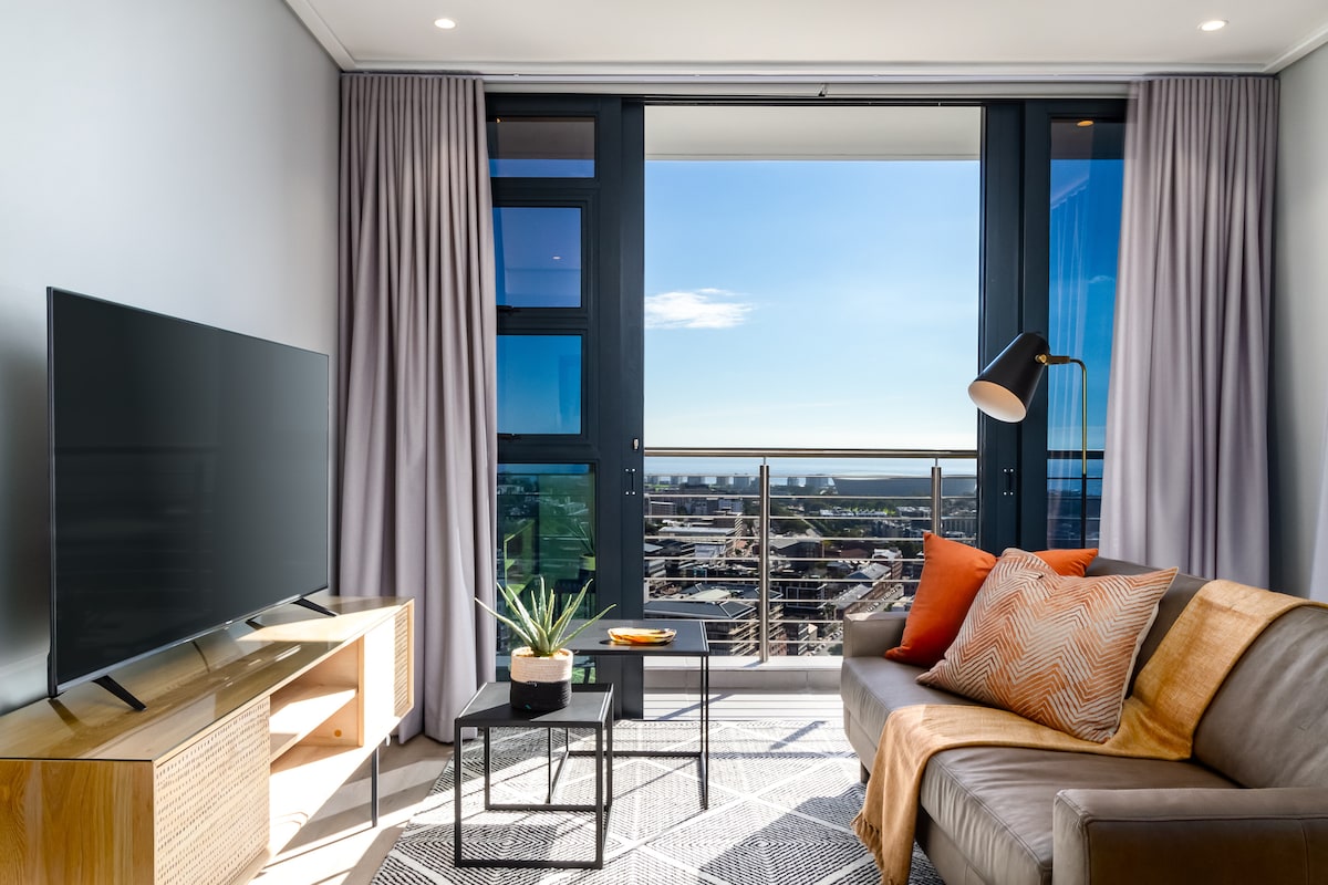 A chic, modern apartment with a big balcony, in the heart of trendy Bree Street, surrounded by top-notch restaurants and just a short walk to all city highlights. Stylishly decorated with all amenities for a super comfortable stay. Perched on the 21st floor, enjoy breathtaking views of the city, Stadium, Robben Island, Signal Hill, and the sparkling sea. Relax on the rooftop terrace with a refreshing drink from the bar. Just a stroll away from the CTICC and the V&A Waterfront. @CapeTown16onBree