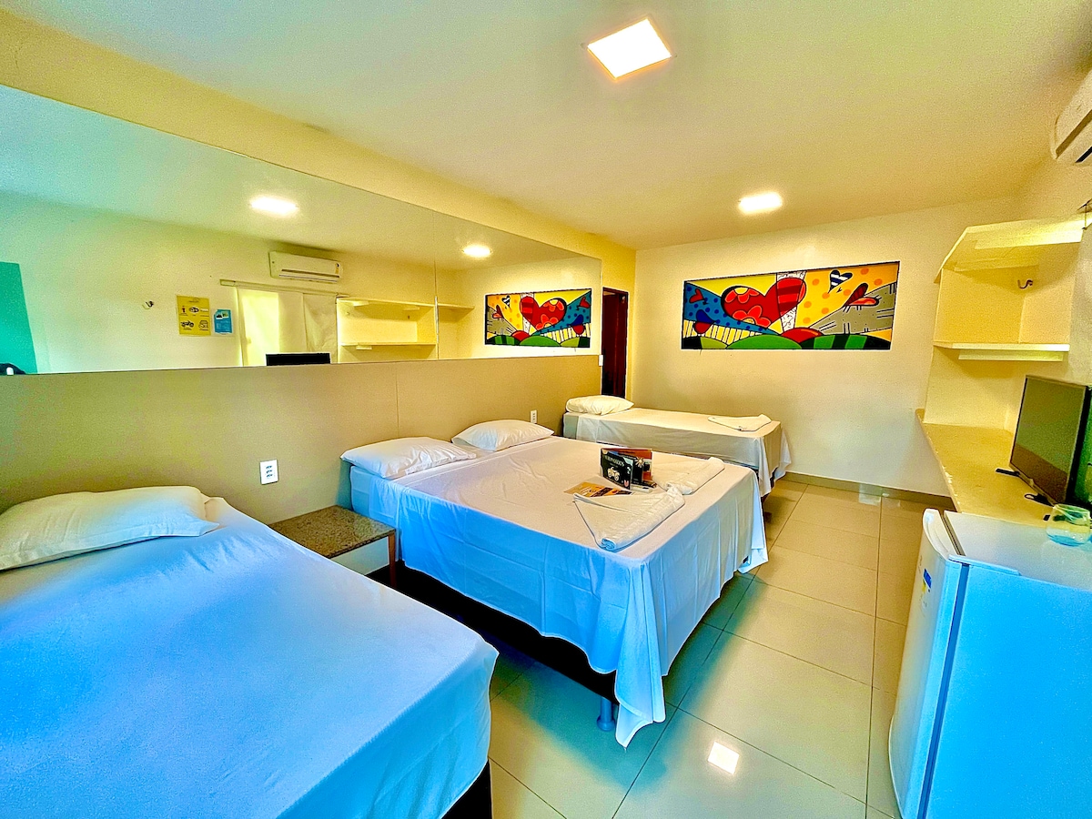 Acomodação com 01 cama de casal e 01 cama de solteiro. Possui ar-condicionado, frigobar, banheiro privativo, TV, chuveiro quente e mesa de trabalho.
