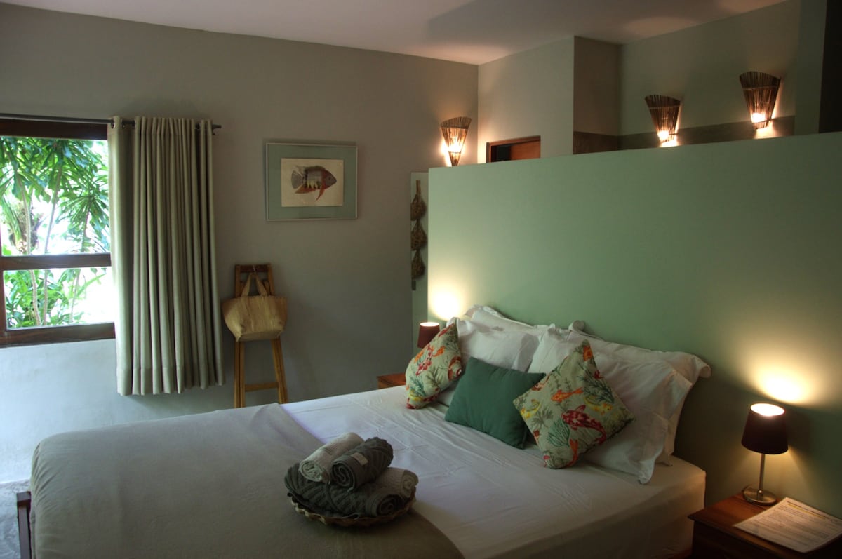 A suite oferece banheiro privado dentro do quarto, ar condicionado, água quente, e frigobar. Dispõe de uma varanda individual e um pátio de uso comum na sombra de um frondoso cajueiro. A varanda oferece espaço privado para duas redes.