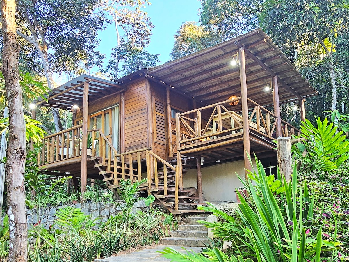 Chalé espaçoso e equipado. Para quem busca um lugar tranquilo em contato com a natureza e perto de tudo. Tem cama de casal, araras para roupas, prateleiras e mesinhas. Cozinha com fogão elétrico 1 boca, micro-ondas, cafeteira, chaleira e sanduicheira elétrica. Frigobar e purificador de água. Banheiro privado com ducha quente. Ar condicionado e ventilador de teto. Wi-fi fibra óptica excelente para trabalho remoto. Uma ducha no jardim, banco e rede para descansar. Um ótima opção de hospedagem!