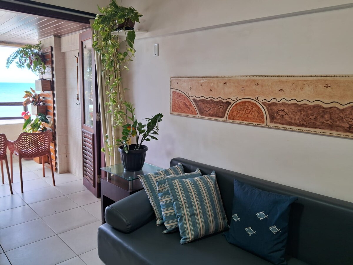 Apartamento aconchegante com vista frente mar deslumbrante. Perfeito para eventos românticos, para lua de mel. Família e amigos também são bem vindos. Hospedamos até 4 pessoas. Oferecemos espaço para trabalho com internet privada super rápida com 500 Mb. Perfeito para longas permanências com geladeira nova e grande duplex e fogão 2 bocas. Sou professora. Preparei tudo com muito carinho e capricho para que você tenha uma hospedagem dos sonhos.
