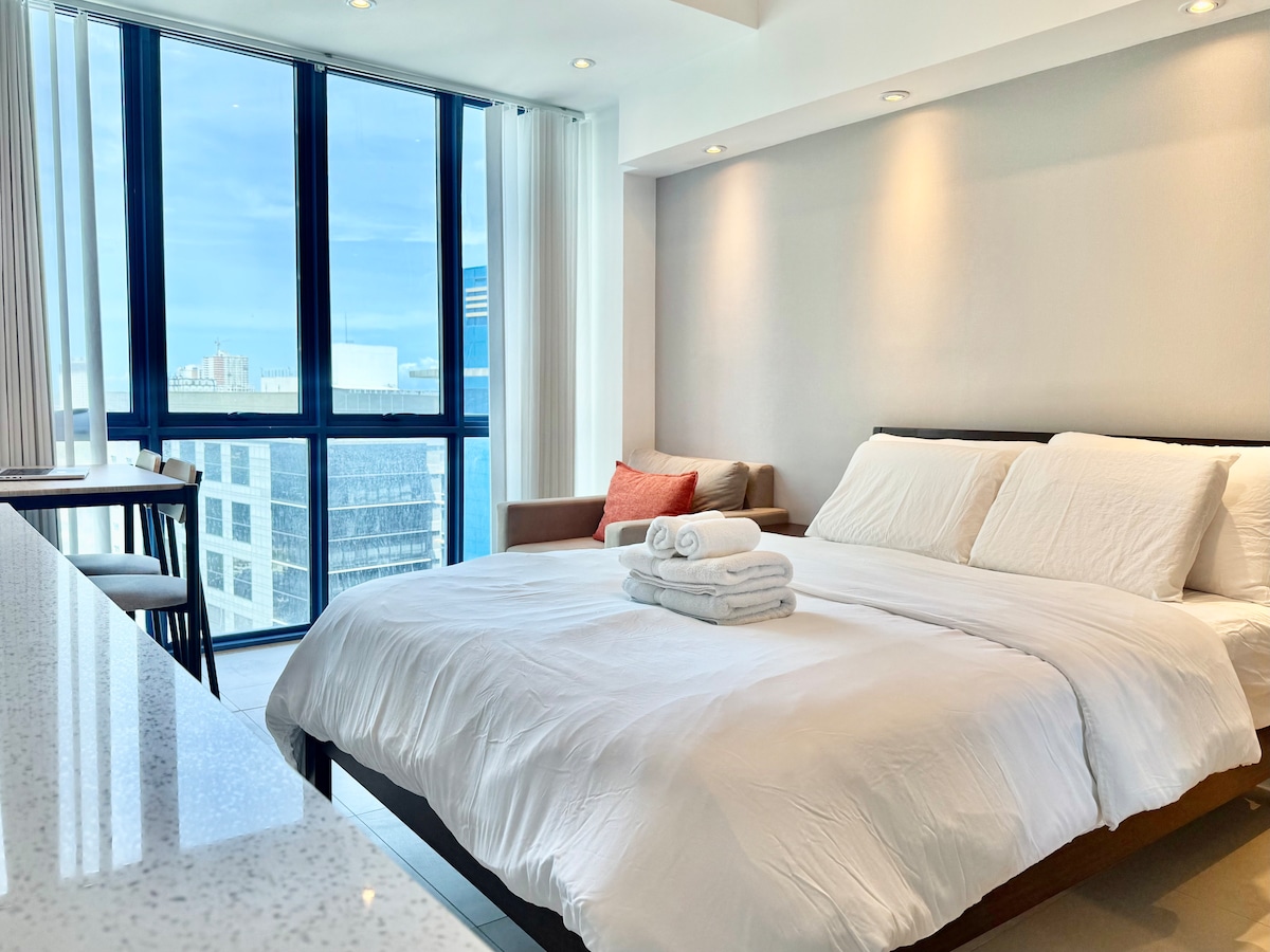 You will love this place for its minimalist yet elegant interior design, the King-Sized bed, the 180 degrees view of Cebu city's coastal view including the new Cordova bridge from the 53rd floor balcony of the tallest building in town and its centralized location where shopping, food, business and night life awaits you every single minute of your stay.
